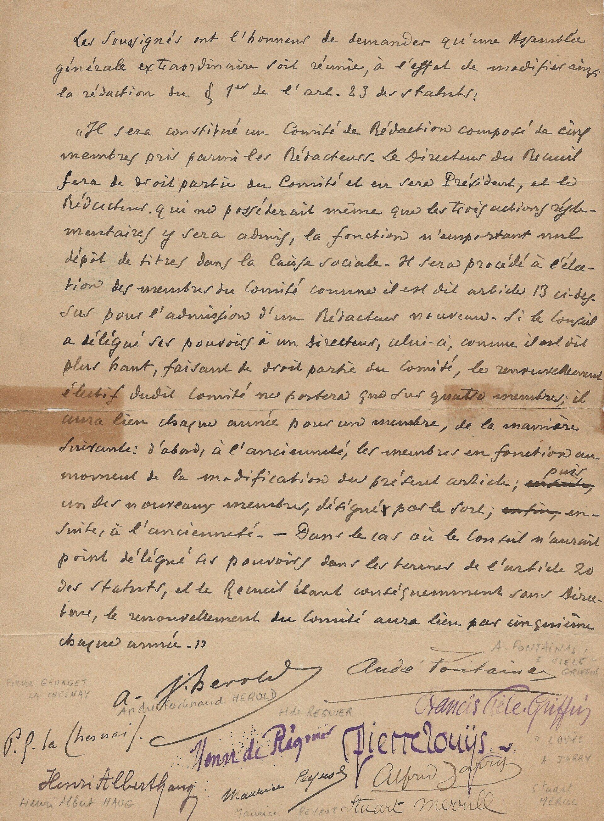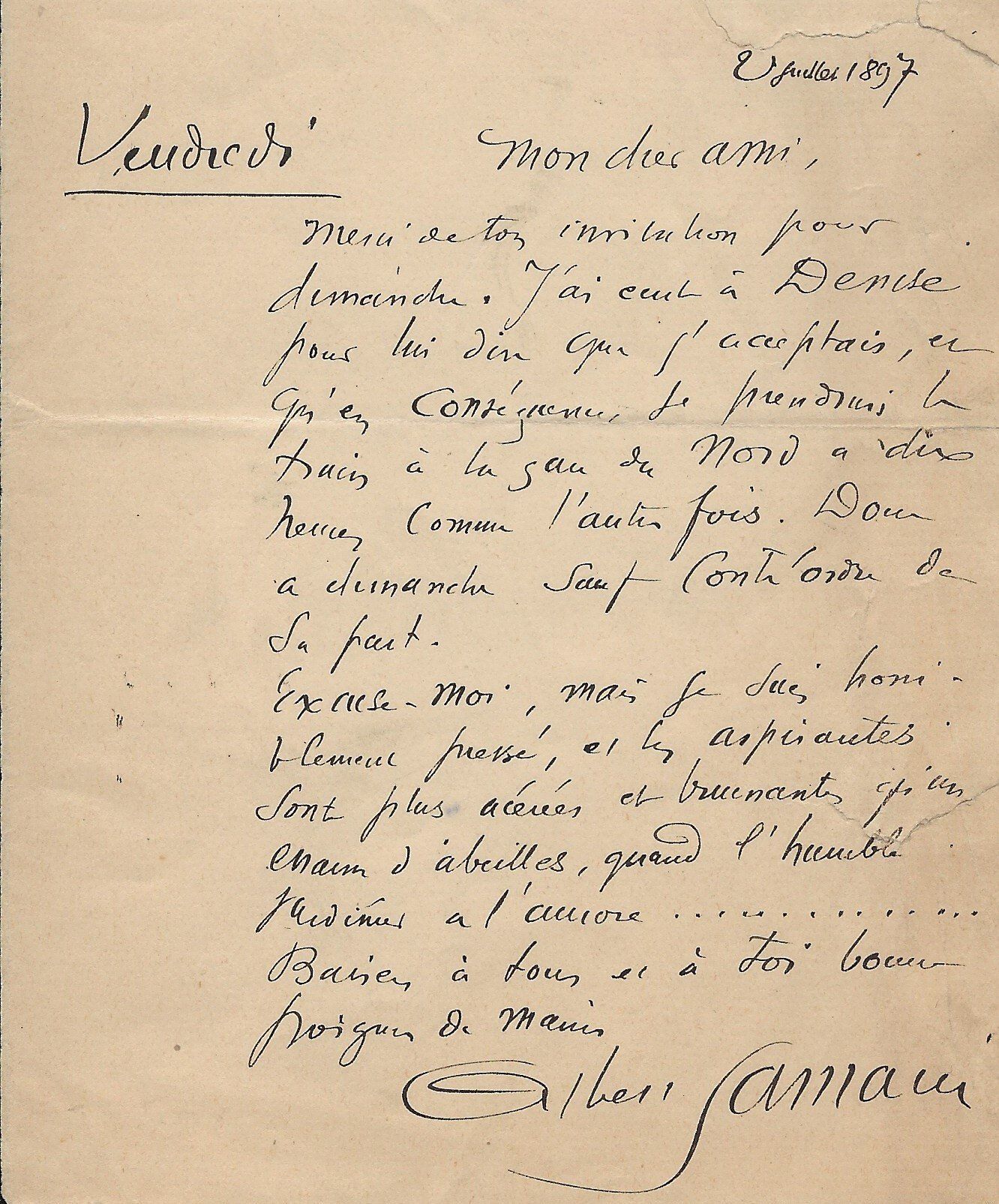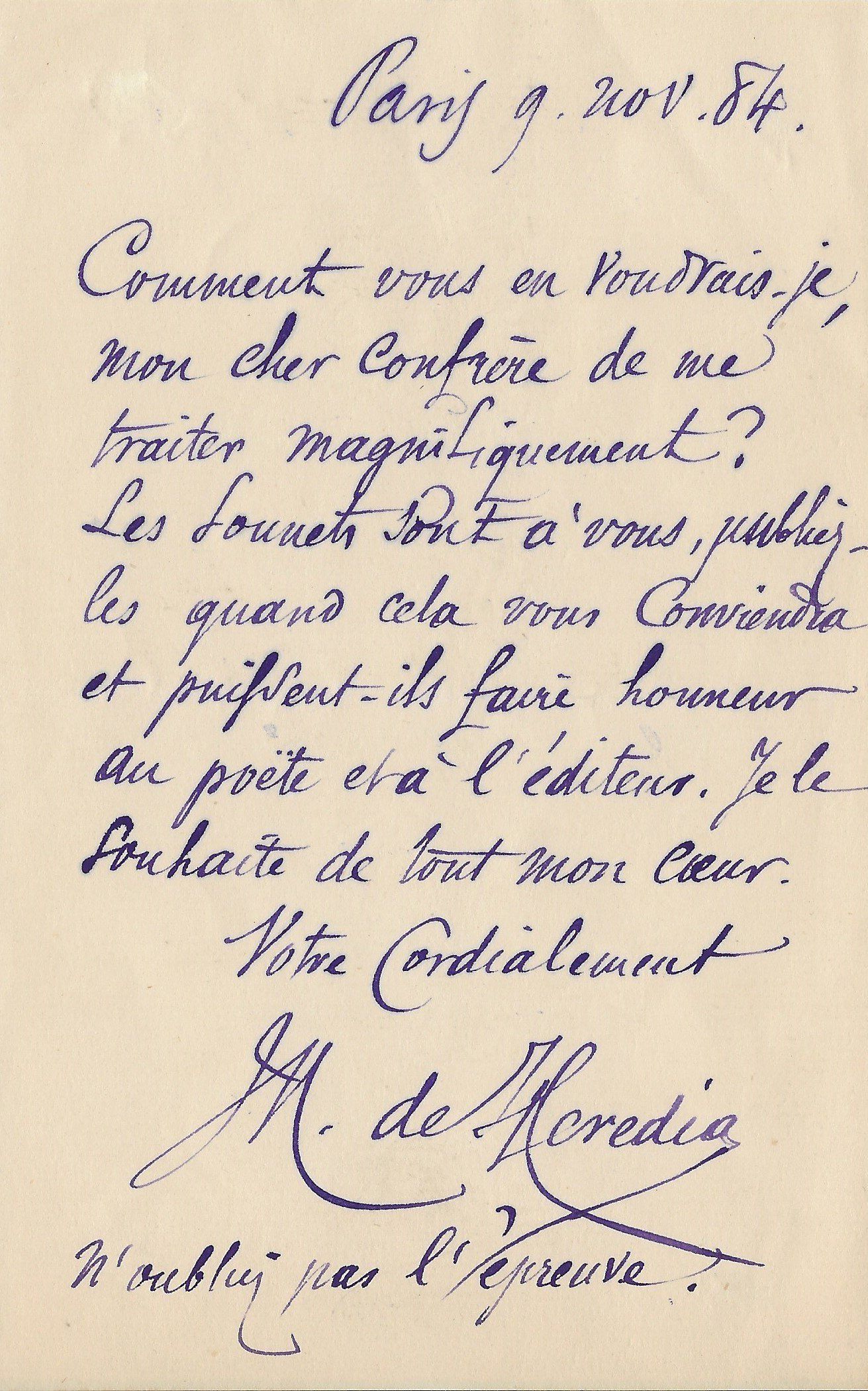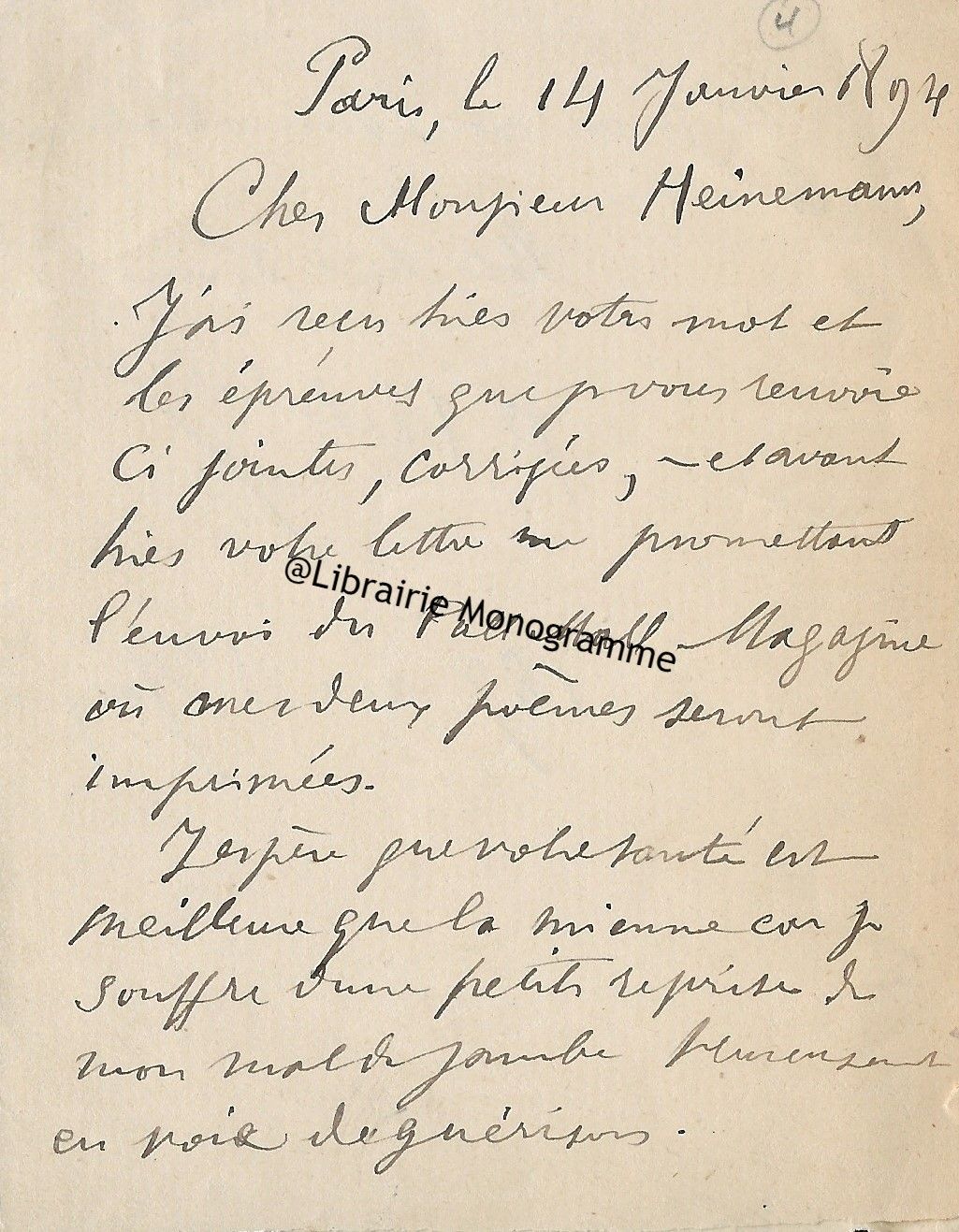 « J’ai reçu hier votre mot et les épreuves que je vous renvoie ci-jointes corrigées, - et avant-hier votre lettre me promettant l’envoi du Pall-Mall Magazine où mes deux poèmes seront imprimés. J’espère que votre santé est meilleure que la mienne car je souffre d’une petite reprise de mon mal de jambe heureusement en voie de guérison… ».