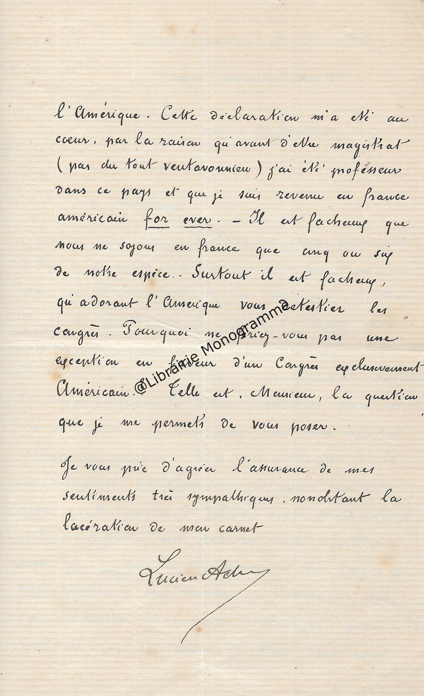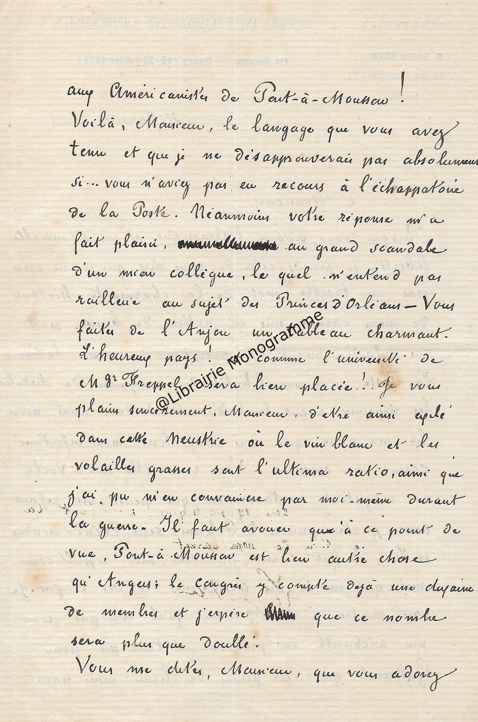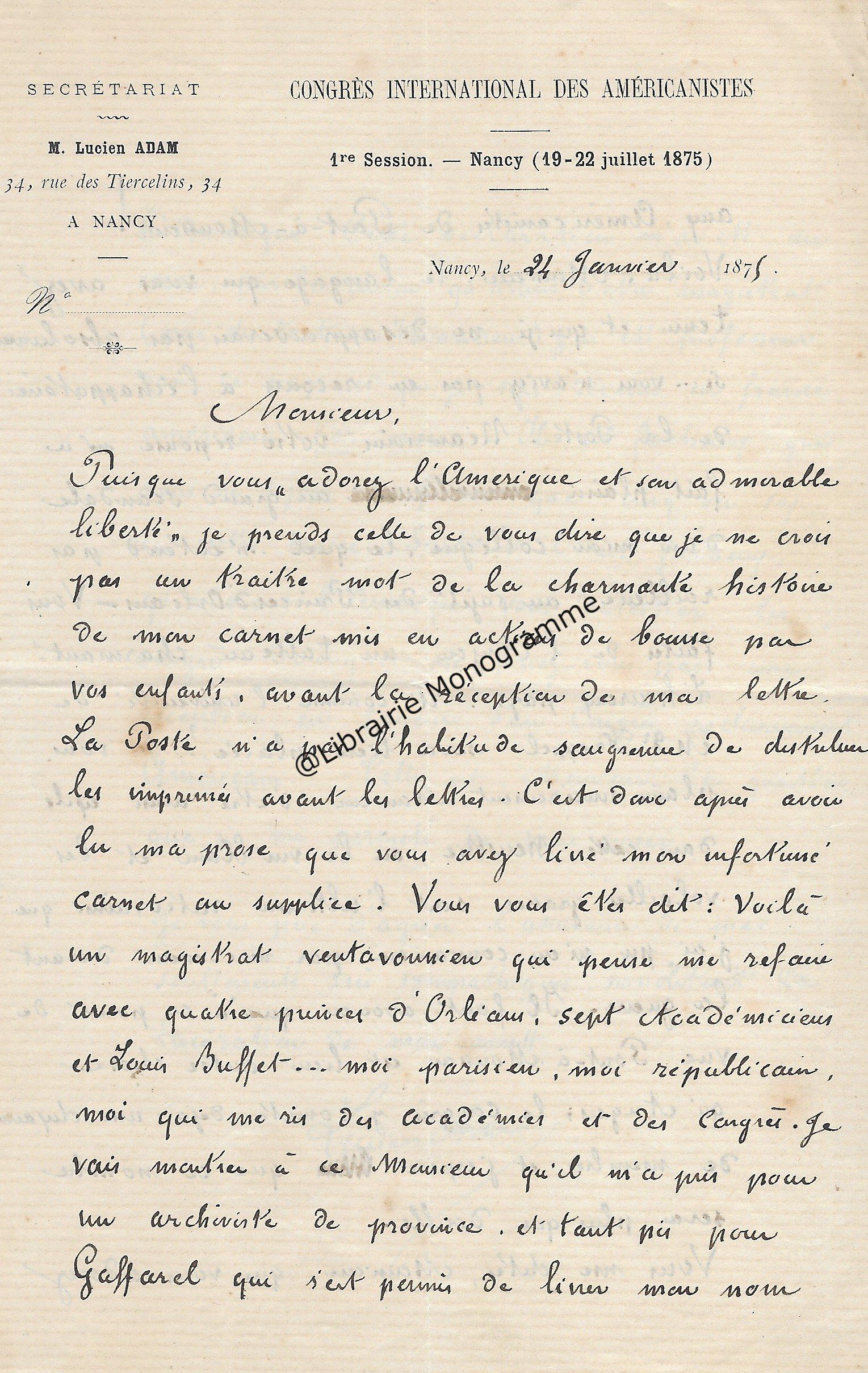 Belle lettre. Le congrès Américaniste peine à séduire et manque d’adhérents. Dans ce contexte, Lucien Adam, alors secrétaire de ce congrès, adresse une première lettre à son correspondant dans laquelle il l’accuse d’avoir lacérer « son carnet », en bourse, puis le qualifie de « Républicain ». Il poursuit tentant de convaincre son correspondant de participer au Congrès International des Américanistes. « Vous faîtes de l’Anjou un tableau charmant. L’heureux pays ! Et comme l’université de Mgr Freppel sera bien placée ! Je vous plains sincèrement Monsieur […] Il faut avouer qu’à ce point de vue, Pont-à-Mousson est bien autre chose qu’Angers, le congrès y compte déjà une dizaine de membres et j’espère que ce nombre sera plus que doublé. […] Surtout, il est fâcheux, qu’adorant l’Amérique, vous détestiez les congrès. Pourquoi ne feriez-vous pas une exception en faveur d’un Congrès exclusivement Américain ? ». Dans la seconde lettre, il lui précise avec humour qu’il n’est pas le Lucien Adam de Louis Le grand, « dont l’habit à queue de morue est demeuré gravé dans votre souvenir ». Il regrette de l’avoir accusé à tort et s’en excuse. A propos des homonymes, pour le premier « je crains fort de lui avoir joué un assez vilain tour de mon métier. En effet, pendant que j’étais substitut près la cour d’appel des Vosges, j’ai requis quelle atroce condamnation contre un Lucien Adam qui avait passé la frontière après avoir banquerouté frauduleusement. Etait-ce votre homme ? J’espère encore que non vu que j’ai eu connaissance il y a deux ou trois ans d’un second homonyme par le fait de la poste. Ceci m’amène à confesser que je vous ai accusé faussement d’avoir lacéré mon carnet après la lettre. Ai-je également porté une fausse accusation en vous qualifiant de Républicain (je n’ai pas dit Radical) ? [ …] Quoi qu’il en soit de la justesse de ma qualification, vous paraissez ne pas croire à la vérité de l’adage que tous les républicains sont des voleurs. Cela m’étonne de votre part. Après cela, ne croyez-vous pas peut-être à la vérité des suivants : Les Bonapartistes sont tous absolument désintéressés. Les Orléanistes méprisent l’argent. Les Légitimistes sont essentiellement progressistes… ». Il termine en lui indiquant qu’il lui adresse de nouveau un carnet « à l’aide duquel j’ai bon espoir que vous nous procurerez dix adhérents Angevins ».