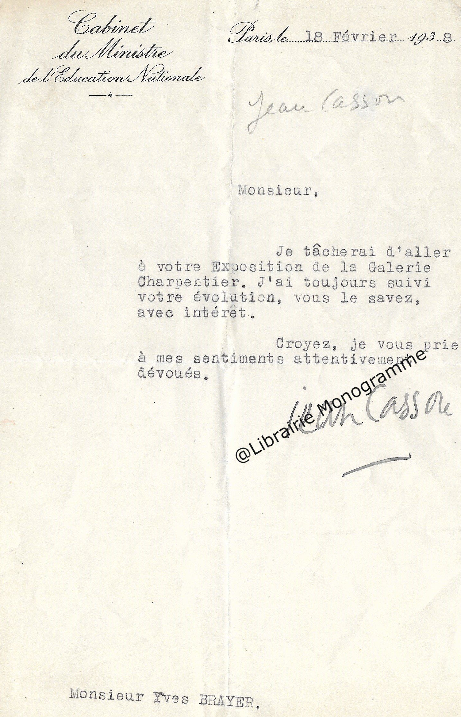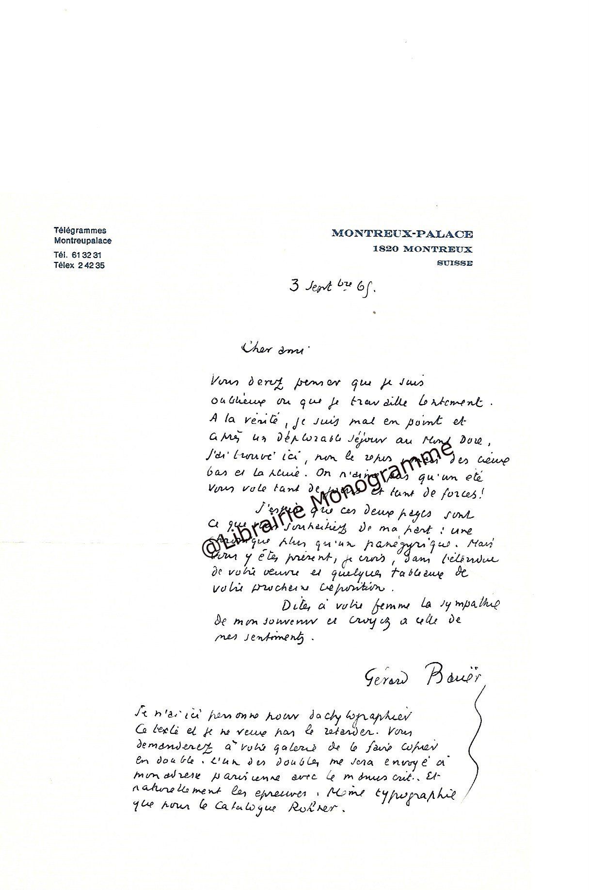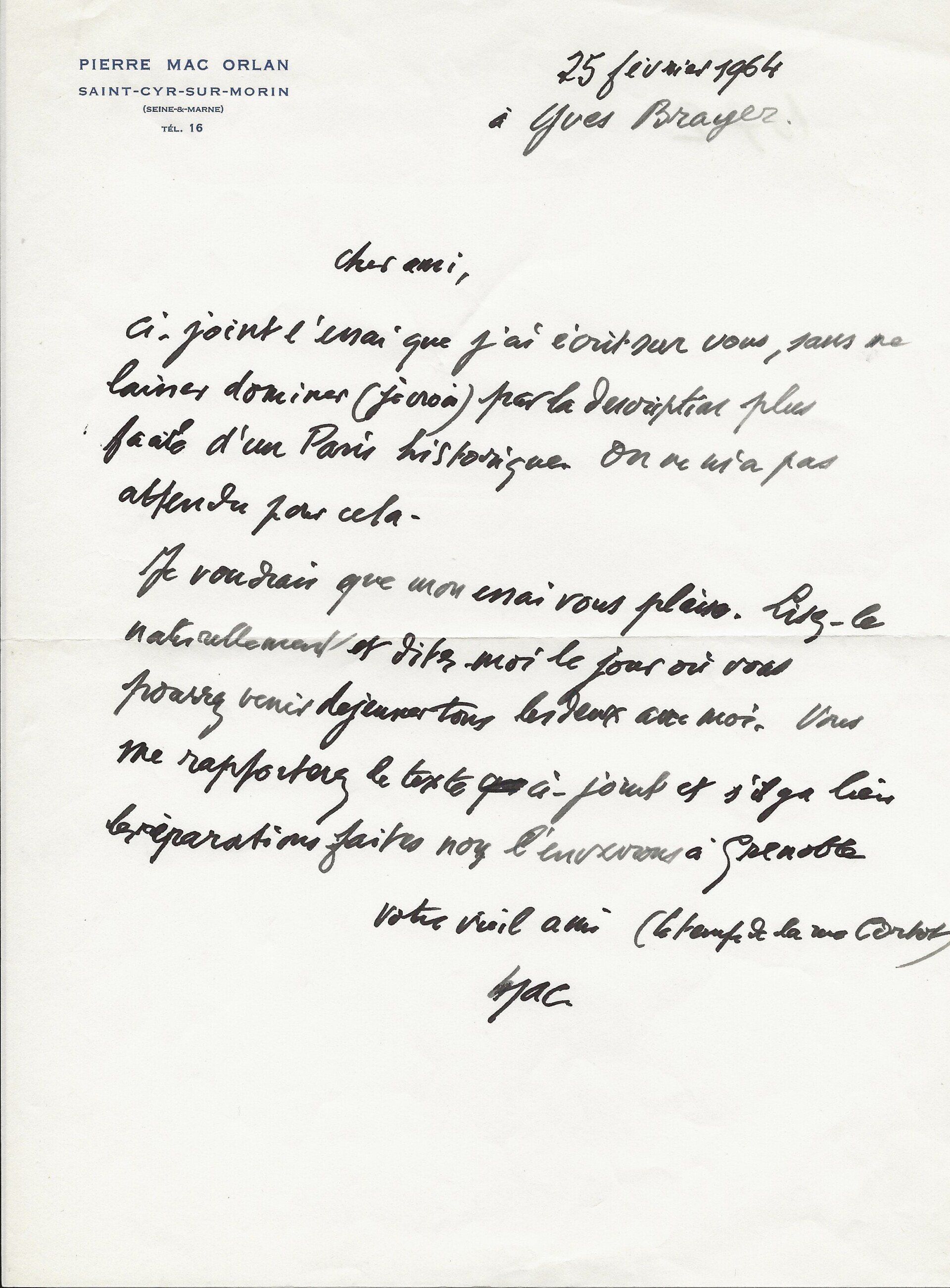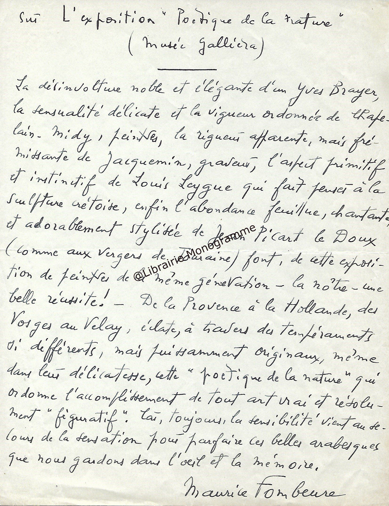 Lettre autographe signée « PEV » et lettre dactylographiée signée « PEV » avec 7 lignes autographes au verso à Yves Brayer.