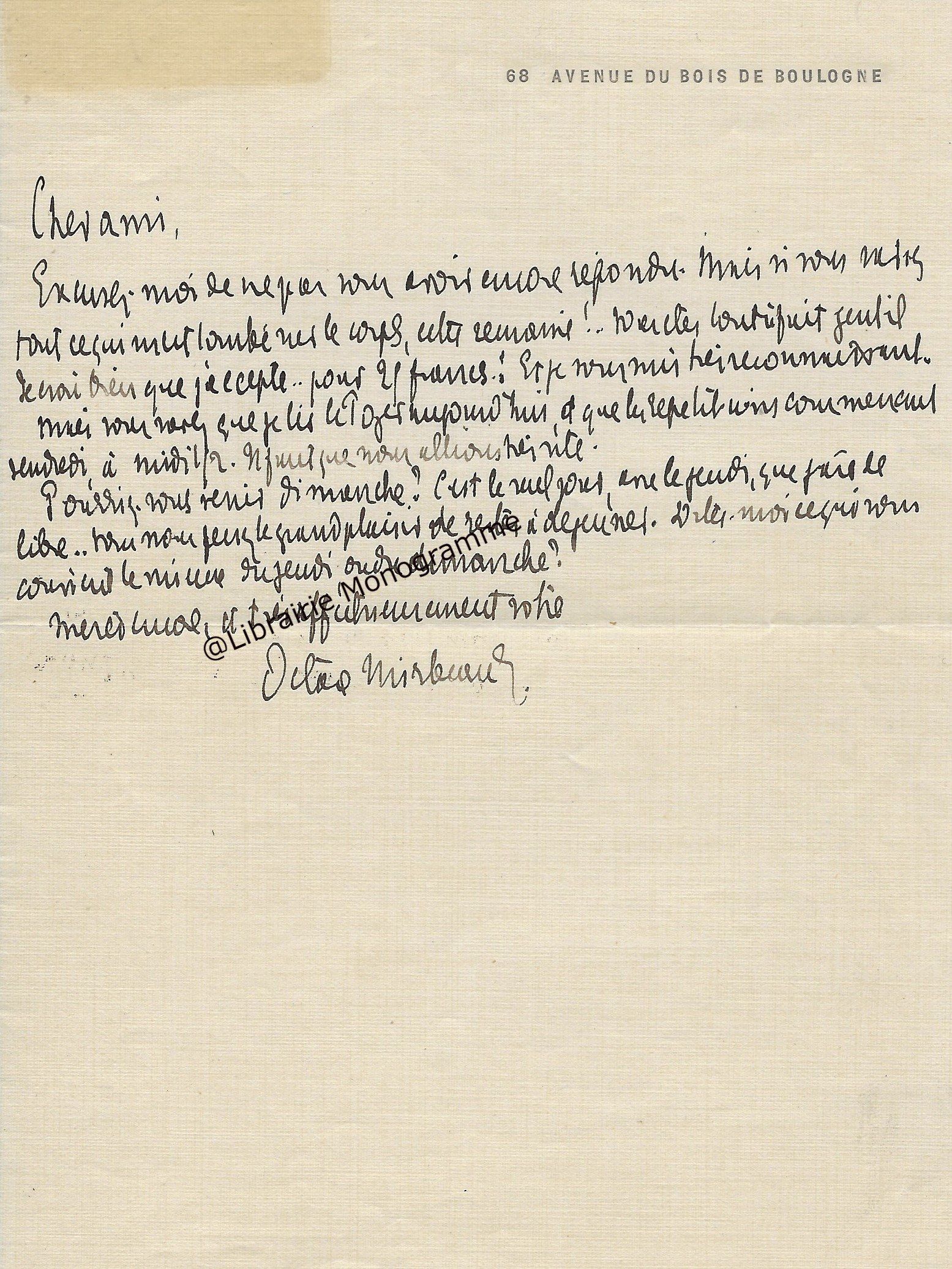 Lettre autographe signée à un avoué, Monsieur Mitouffleh. Paris, ce 25 avril. 1 p. ½ in-8.