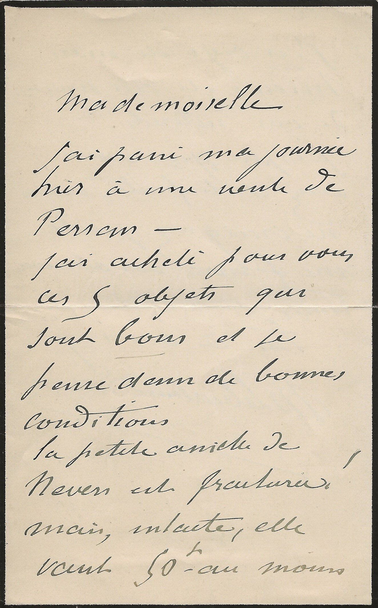 « Mon cher monsieur Astre Je suis bien en retard pour vous accuser réception de votre lettre de la semaine dernière. J’ai fait votre réclamation et je suis rentré dans les 12 frs indûment réclamés. J’en ai fait sur l’heure un usage immoral, mais cependant je les tiens à votre disposition. Le meilleur emploi, à mon avis, ce sera de les boire ensemble quand vous viendrez à Paris. En attendant, cordiale poignée de main et bien à vous ».