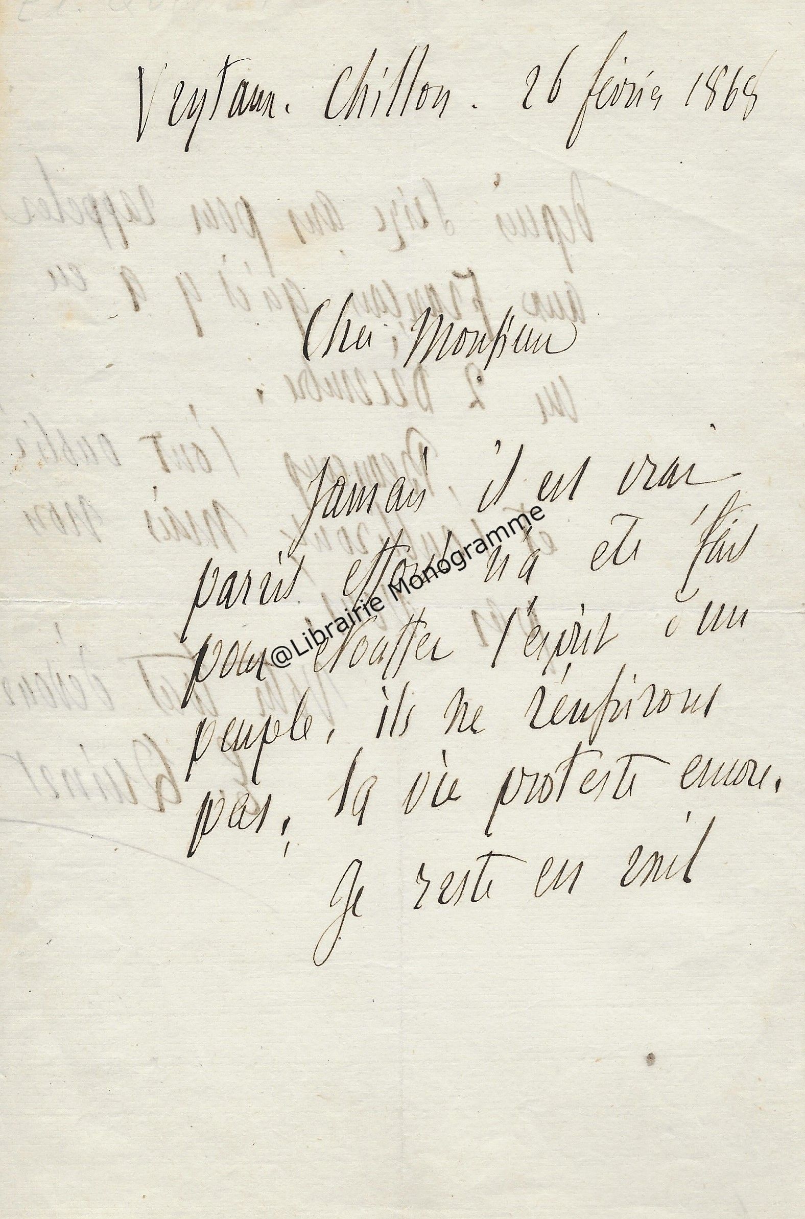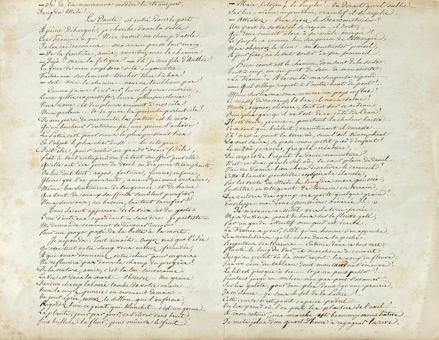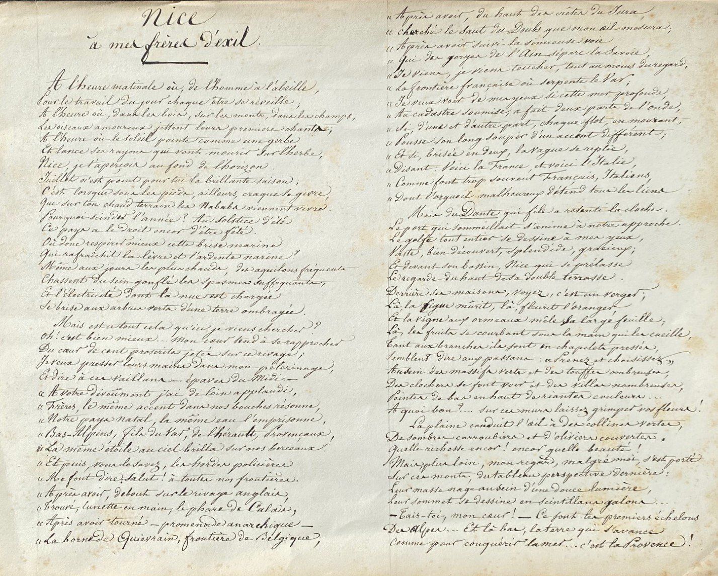 Poème autographe signé intitulé « A mes frères d’exil ». Nice, 15 juillet 1855. 2 pp. in-plano oblong. (37,5 x 29 cm).