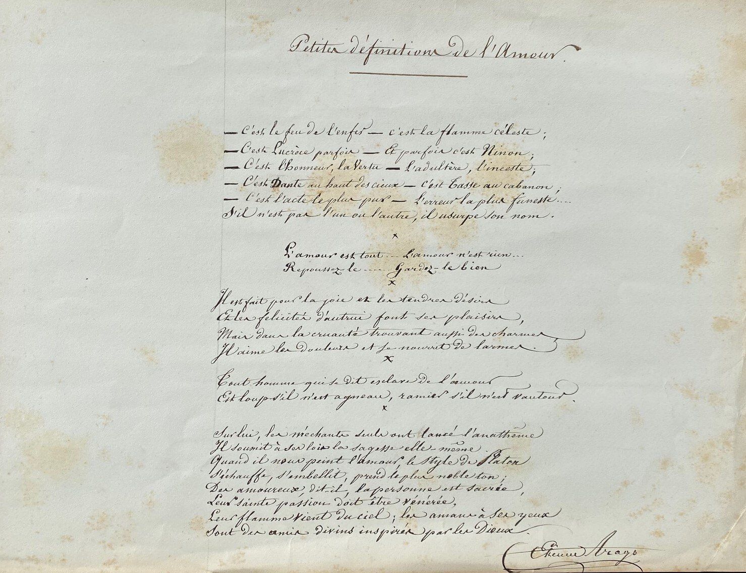 Poème autographe signé intitulé « Petites définitions de l’Amour » En exil, 1 pp. oblong. in-plano (37,5 x 29 cm).