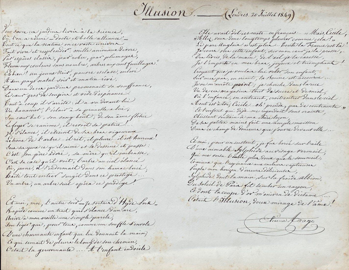 Poème autographe signé intitulé « Illusion ». En exil, Londres, 20 juillet 1849. 1 pp. in-plano oblong. (37,5 x 29 cm).