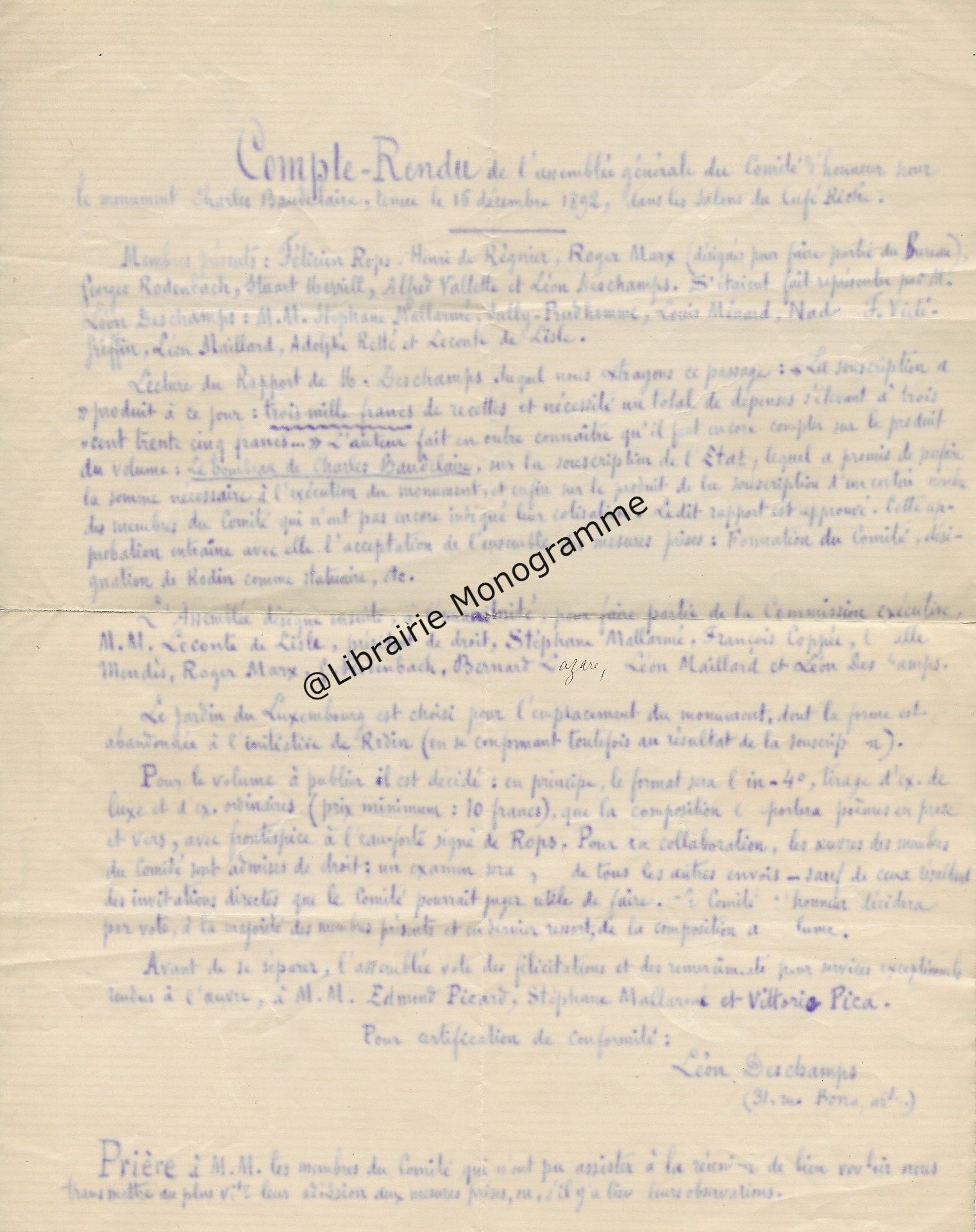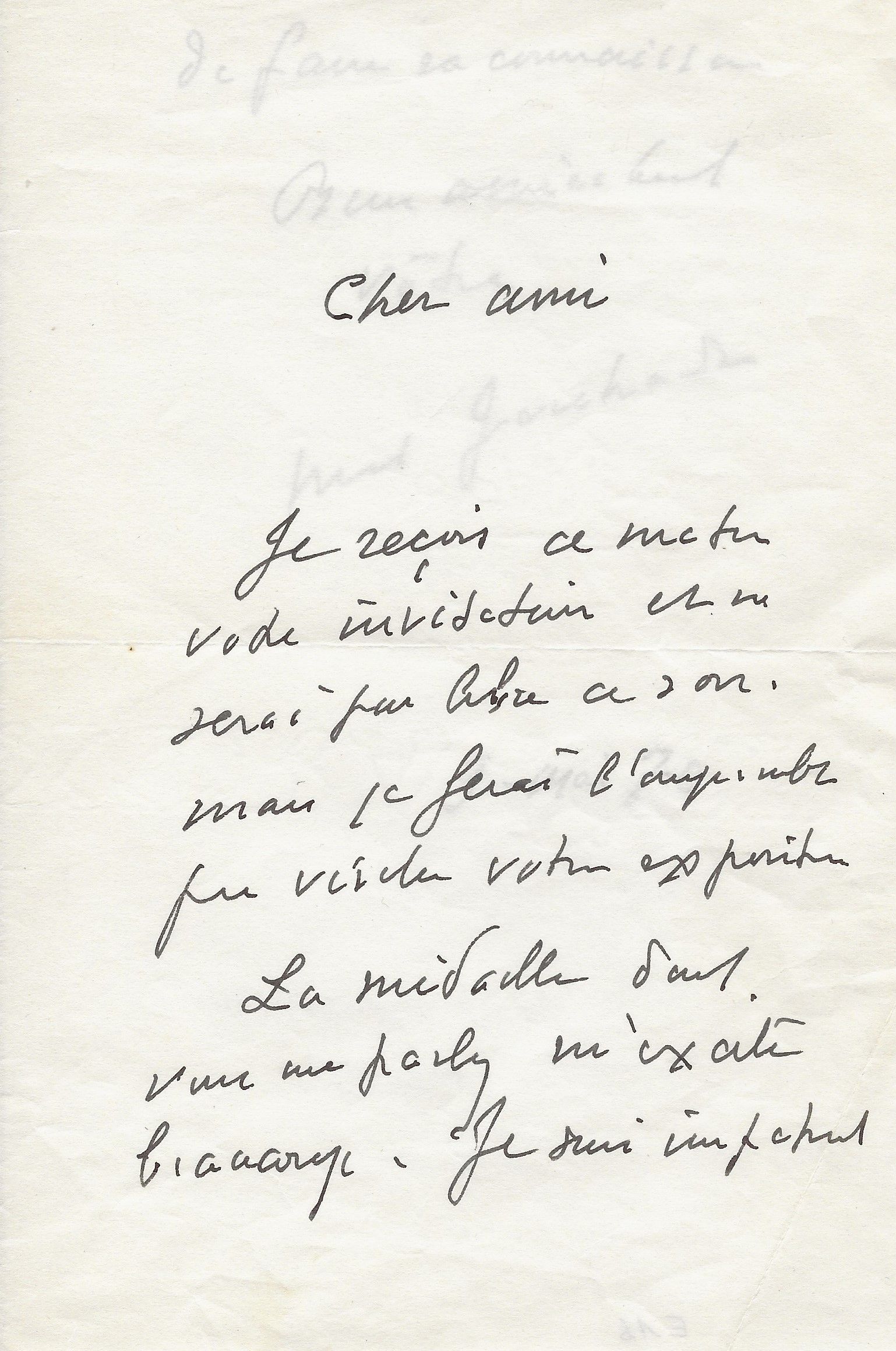 Charmant témoignage de l’amitié portée au sculpteur. « Le journal vient de nous apporter à Blonville l’heureuse nouvelle de la "réparation" attendue. Je vous envoie toutes mes félicitations. Je me réjouis avec tous vos amis et avec tous les admirateurs de votre talent. Veuillez faire part de ma joie à Madame de Saint-Marceaux et recevoir pour vous et les vôtres, mes sincères amitiés. ».