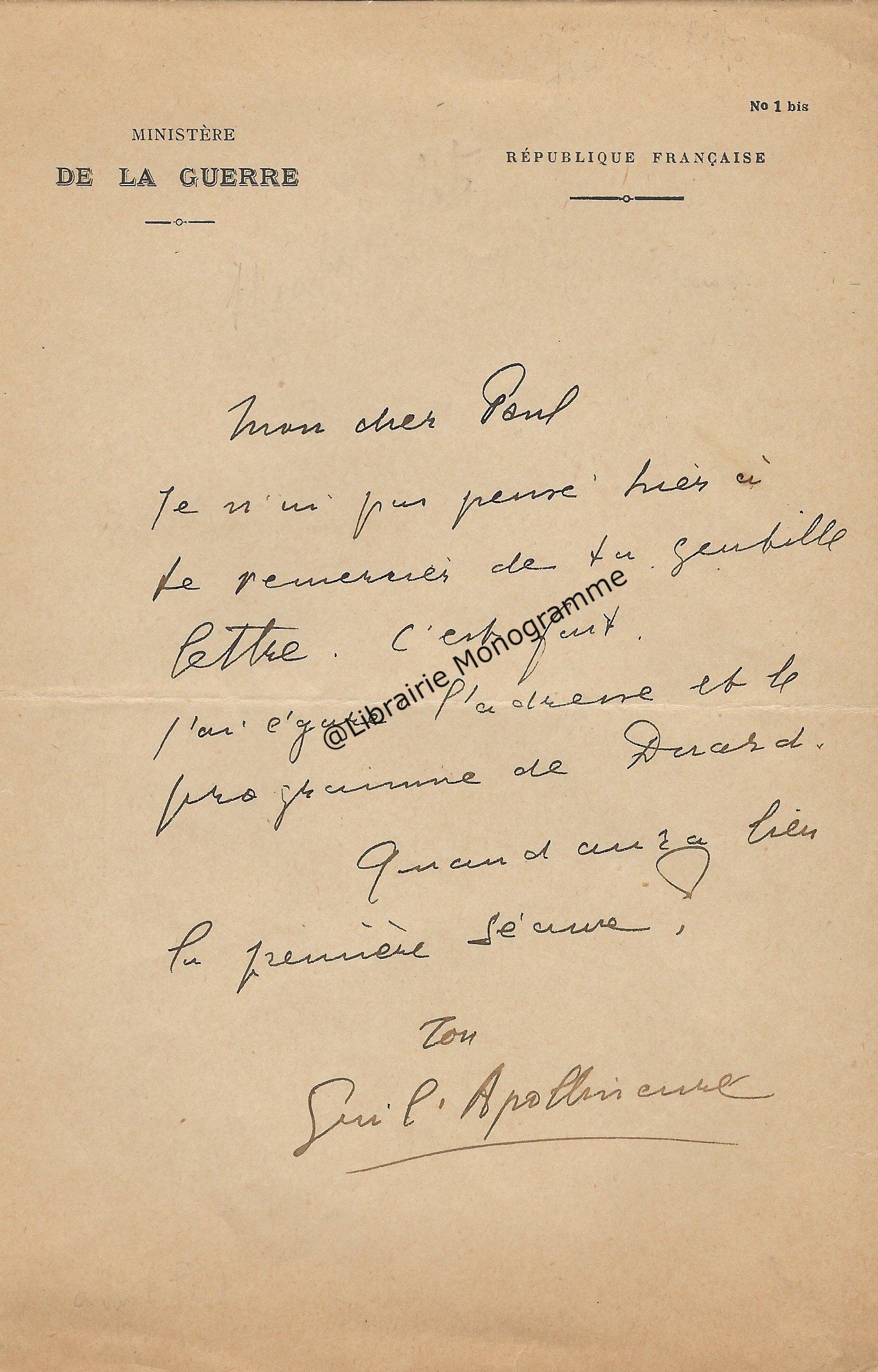 En-tête du Ministère de la Guerre. 1 p. in-8.