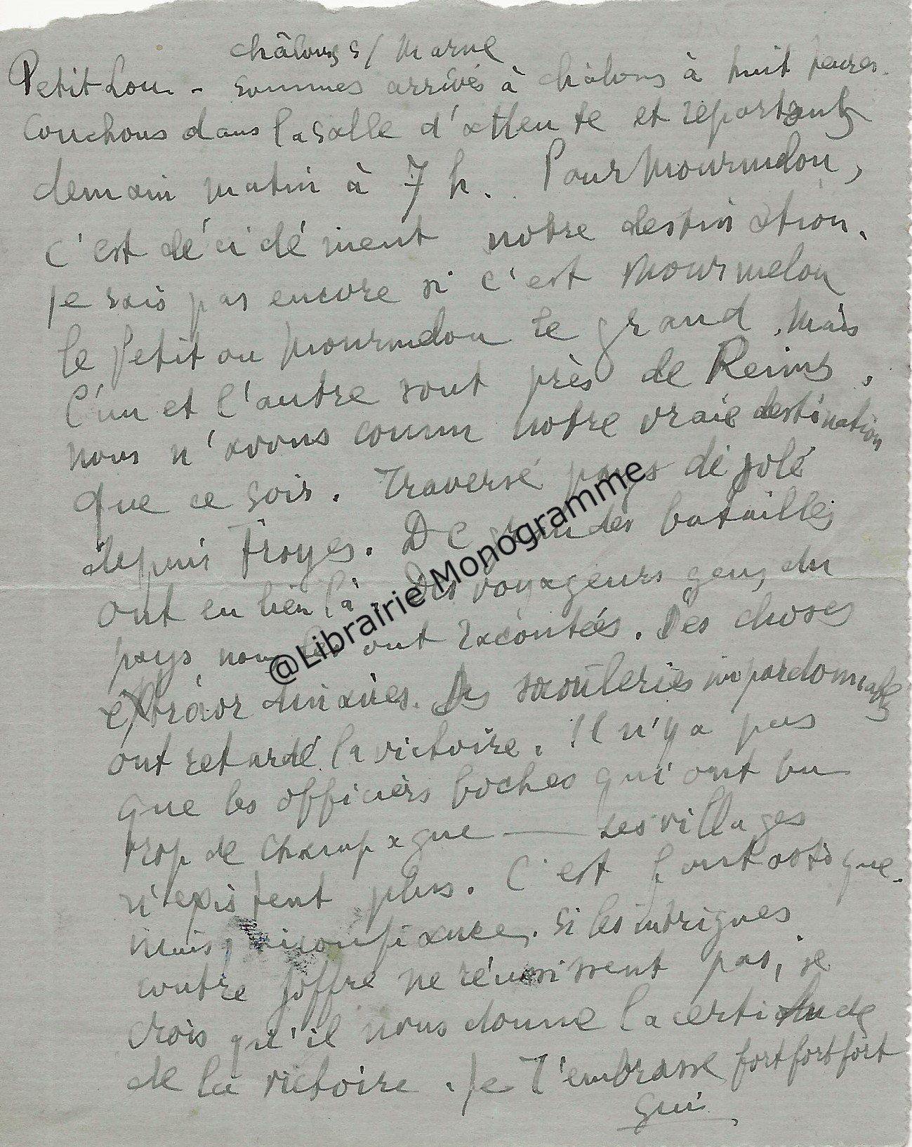 Après avoir patienté plusieurs heures dans la Salle d’attente de Châlons, il annonce à son « Petit Lou », son départ dès le lendemain pour Mourmelon. « C’est décidément notre destination. Je sais pas encore si c’est Mourmelon le Petit ou Mourmelon le Grand. Mais l’un et l’autre sont près de Reims. Nous n’avons connu notre vraie destination que ce soir. Traversé pays désolé depuis Troyes. De grandes batailles ont eu lieu là. Des voyageurs, gens du pays nous les ont racontées. Des choses extraordinaires. Des saouleries impardonnables ont retardé la victoire. Il n’y a pas que les officiers boches qui ont bu trop de champagne. Les villages n’existent plus. C’est fantastique mais j’ai confiance Si les intrigues contre Joffre ne réussissent pas, je crois qu’il nous donne la certitude de la victoire. Je t’embrasse fort fort fort. ».