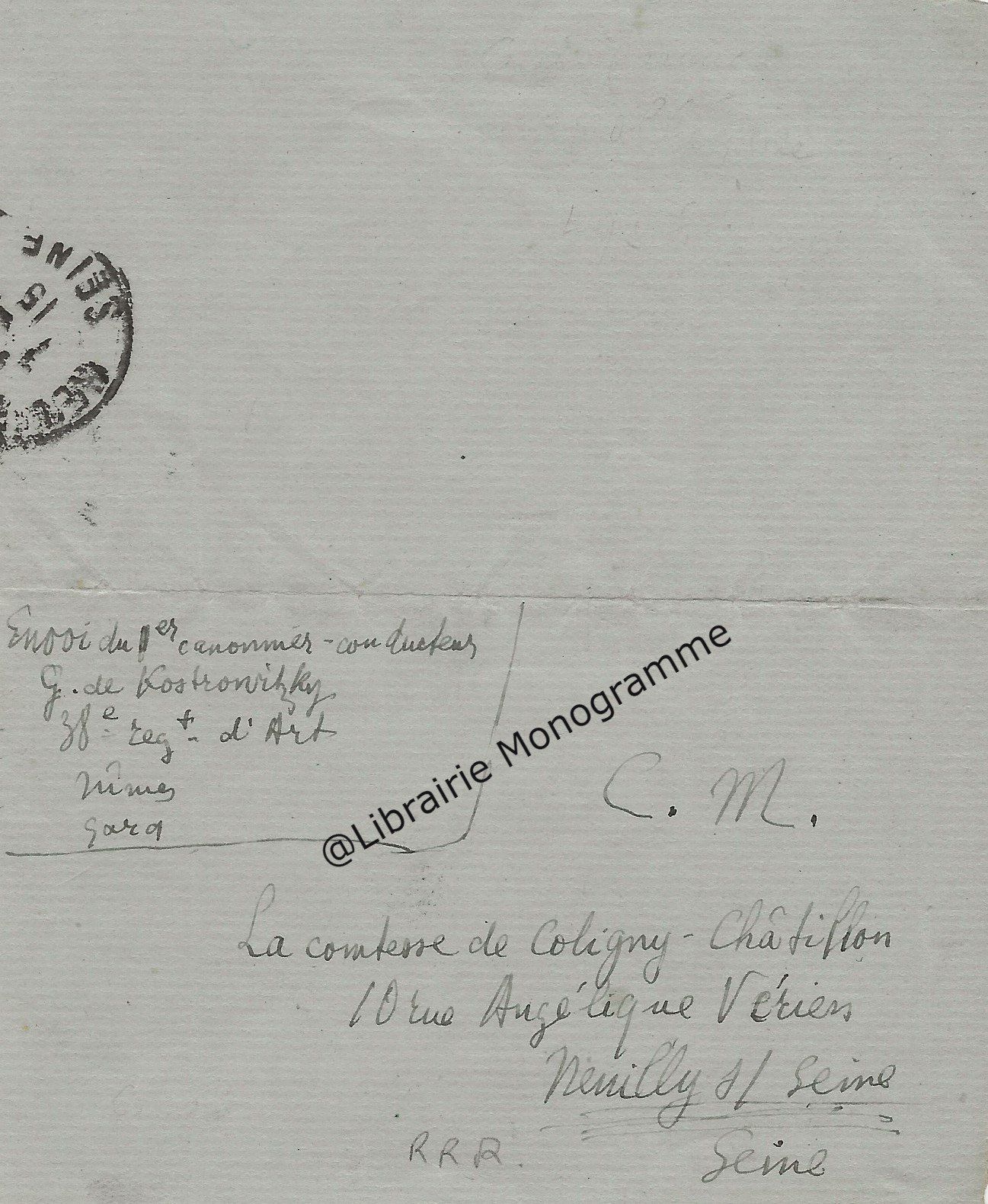 Envoi du 1er canonnier-conducteur ; G. de Kostrowitzky. 38ème régiment d’Art. Nîmes. Gard.