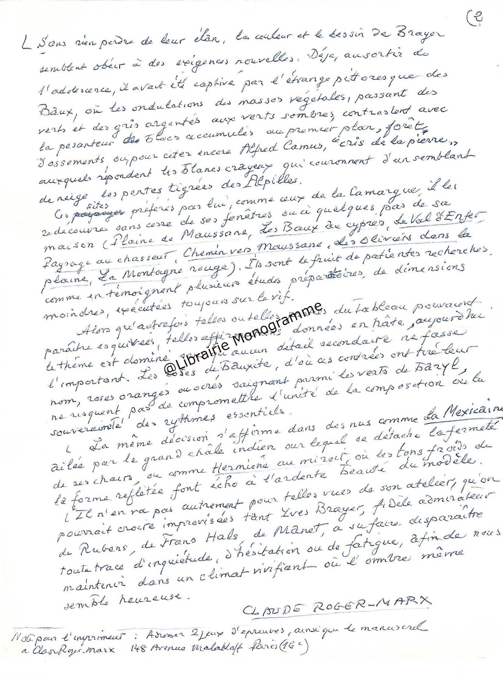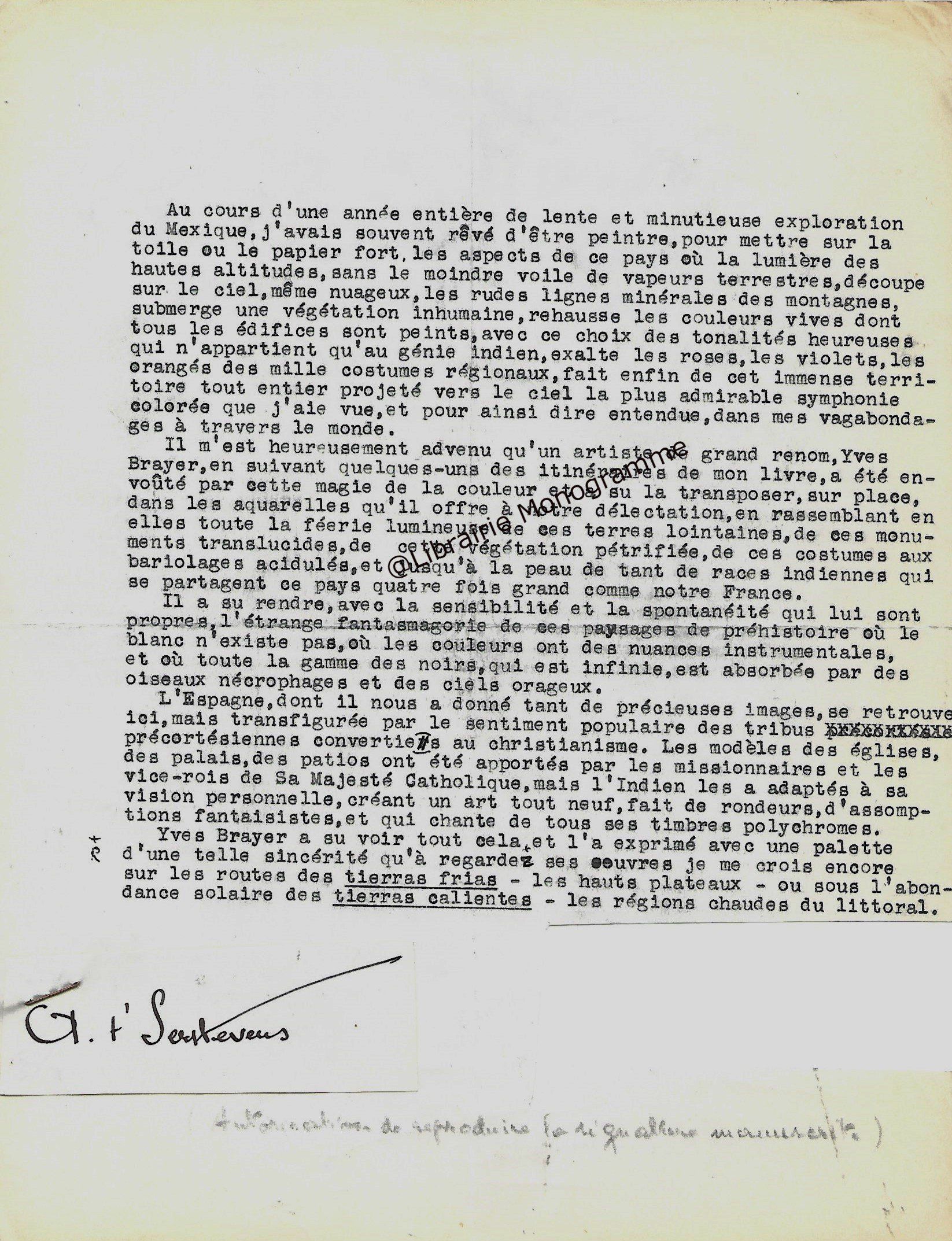 Dans son texte, le romancier fait allusion à son livre « Mexique, pays à trois étages », éditions Arthaud de 1955, qui a certainement influencé Brayer. « Il m’est heureusement advenu qu’un artiste de grand renom, Yves Brayer, en suivant quelques-uns des itinéraires de mon livre, a été envoûté par cette magie de la couleur et a su la transposer sur place, dans les aquarelles qu’il offre à notre délectation, en rassemblant en elles toute la féérie lumineuse de ces terres lointaines, de ces monuments translucides de cette végétation pétrifiée, de ces costumes aux bariolages acidulés, et jusqu’à la peau de tant de races indiennes qui se partagent ce pays quatre fois plus grand comme notre France… ».