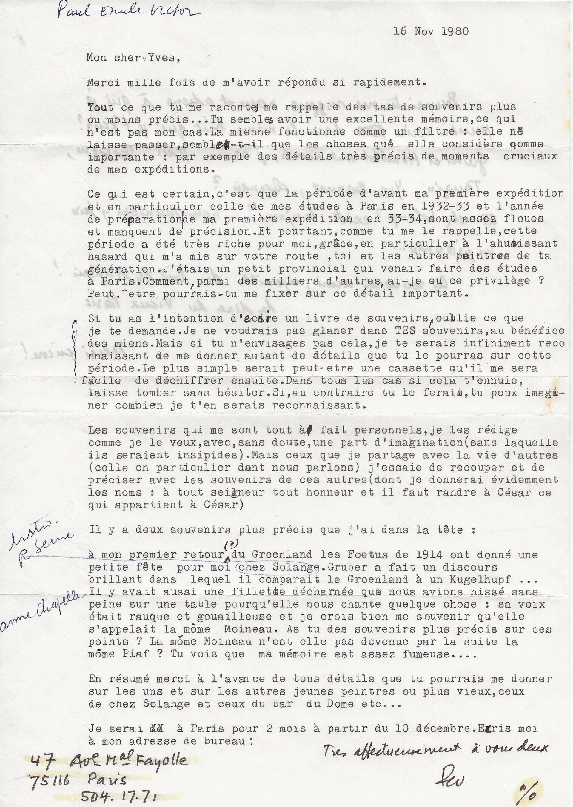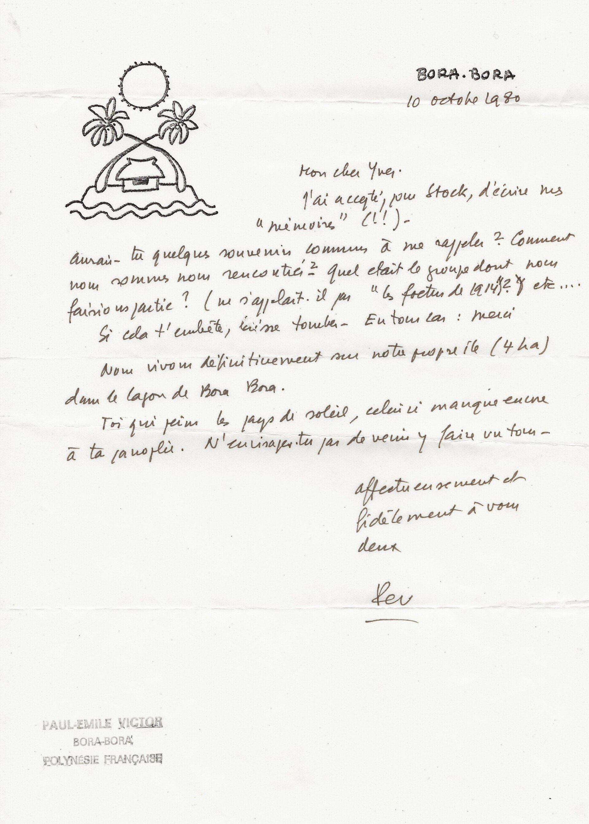 Très intéressantes lettres relatives à la publication des mémoires de l’explorateur, mémoires demandées par l’éditeur Stock. Il lui apprend son installation définitive dans le lagon de Bora-Bora, « sur notre propre île (4 ha) » et le questionne sur leur passé. « As-tu quelques souvenirs communs à me rappeler ? Comment nous nous sommes nous rencontrés ? Quel était le groupe dont nous faisions partie ? (Ne s’appelait-il pas "les fœtus de 1914") […] Toi qui peins les pays de soleil, celui-ci manque encore à ta panoplie. N’envisages-tu pas de venir y faire un tour… ». A une réponse favorable du peintre, il se félicite de « l’ahurissant hasard » qu’a été leur rencontre, « toi et les autres peintres de ta génération », Il subsiste un certain flou. « Ce qui est certain, c’est que la période d’avant ma première expédition et en particulier celle de mes études à Paris en 1932-1933 et l’année de préparation de ma première expédition en 33-34, sont assez floues et manquent de précisions. Et pourtant, comme tu me le rappelles, cette période a été très riche pour moi ». Il le questionne de nouveau sur d’autres détails, en particulier sur une petite fête donnée en son honneur au retour de sa première expédition du Groenland. « Les Fœtus de 1914 ont donné une petite fête pour moi chez Solange. Gruber a fait un discours brillant dans lequel il comparait le Groenland à un kugelhupf (sic, pour kougelhopf)… Il y avait aussi une fillette décharnée que nous avions hissé sans peine sur une table pour qu’elle nous chante quelque chose : sa voix était rauque et gouailleuse et crois bien me souvenir qu’elle s’appelait la môme Moineau. As-tu des souvenirs plus précis sur ces points ? La môme Moineau n’est-elle pas devenue par la suite la môme Piaf ? Tu vois que ma mémoire est assez fumeuse… ». Enfin au verso de cette très longue lettre, l’explorateur ajoute de sa main : « Pourrais-tu me suggérer noms et adresses à qui je pourrai écrire dans le même but que je t’écris ? Gruber et Humblot sont morts, je sais - mais Despierre, Tauzin, Yves-Bonnat, Chesnais ? Et chez Solange ? existe toujours ? nous pourrions y faire un pèlerinage… Des souvenirs aussi, si possible du Bal des Anglais ! Les dîners du Vieux Paris… ».