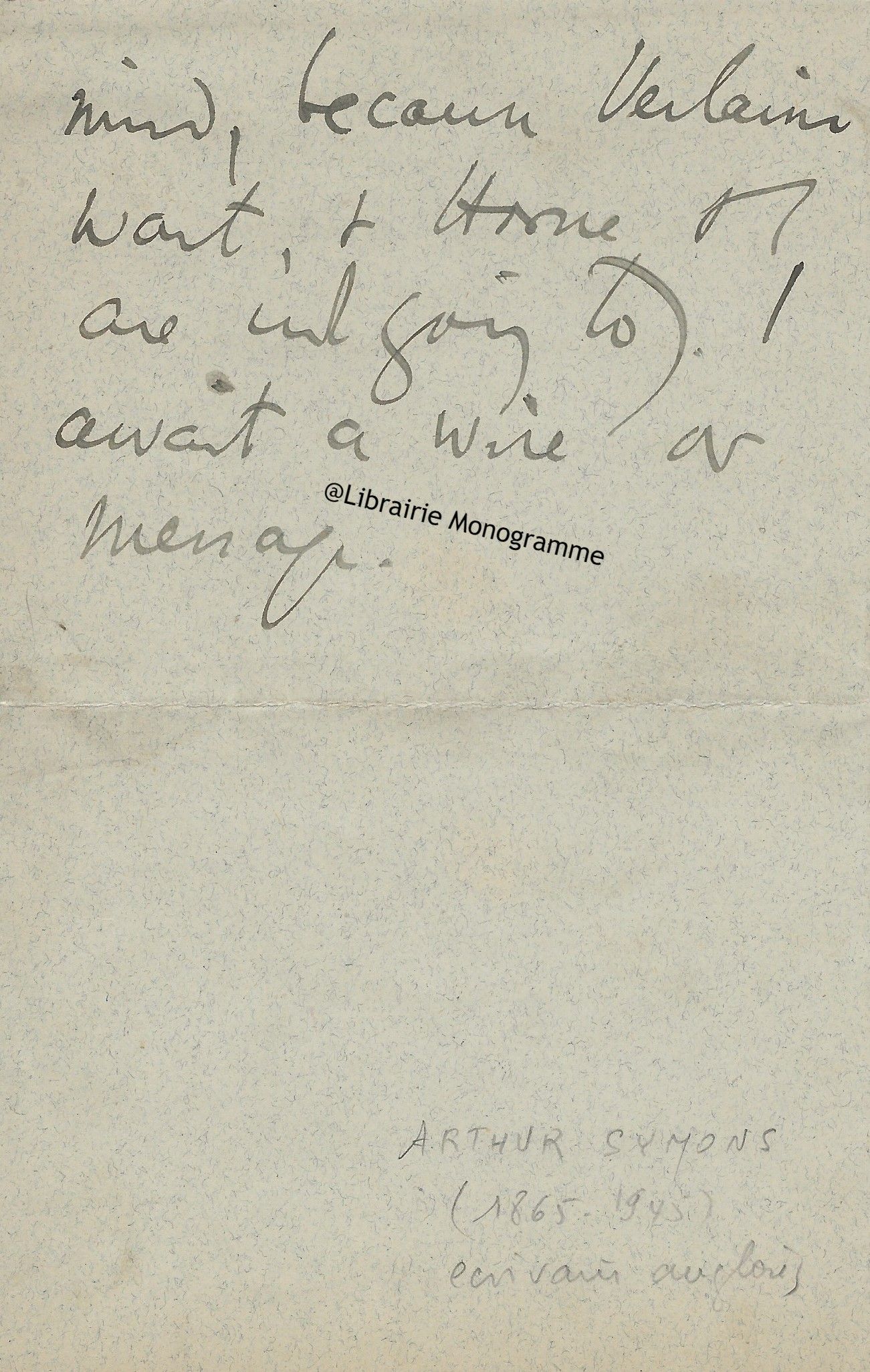 Verlaine vient pour la première fois à la maison d’édition Heinemann à Londres et Symons souhaite l’accueillir le plus chaleureusement possible. Il demande donc à l’éditeur une bonne adresse pour aller dîner en lui précisant avec humour qu’il faudra surveiller la consommation de vin de Verlaine… Symons traduira en anglais les poèmes de Baudelaire, de Mallarmé et de Verlaine avec lequel il entretiendra une correspondance assidue.
