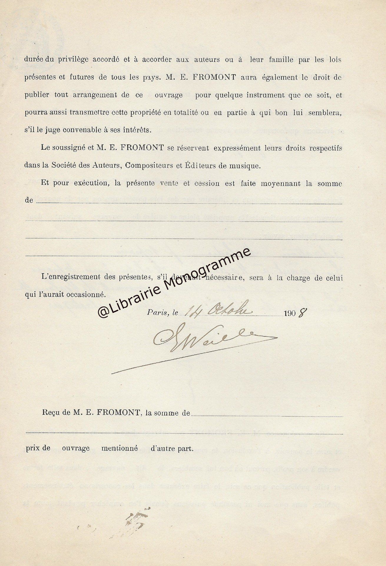 Contrat signé avec l’éditeur de musique Eugène Fromont, pour la cession de plusieurs œuvres :