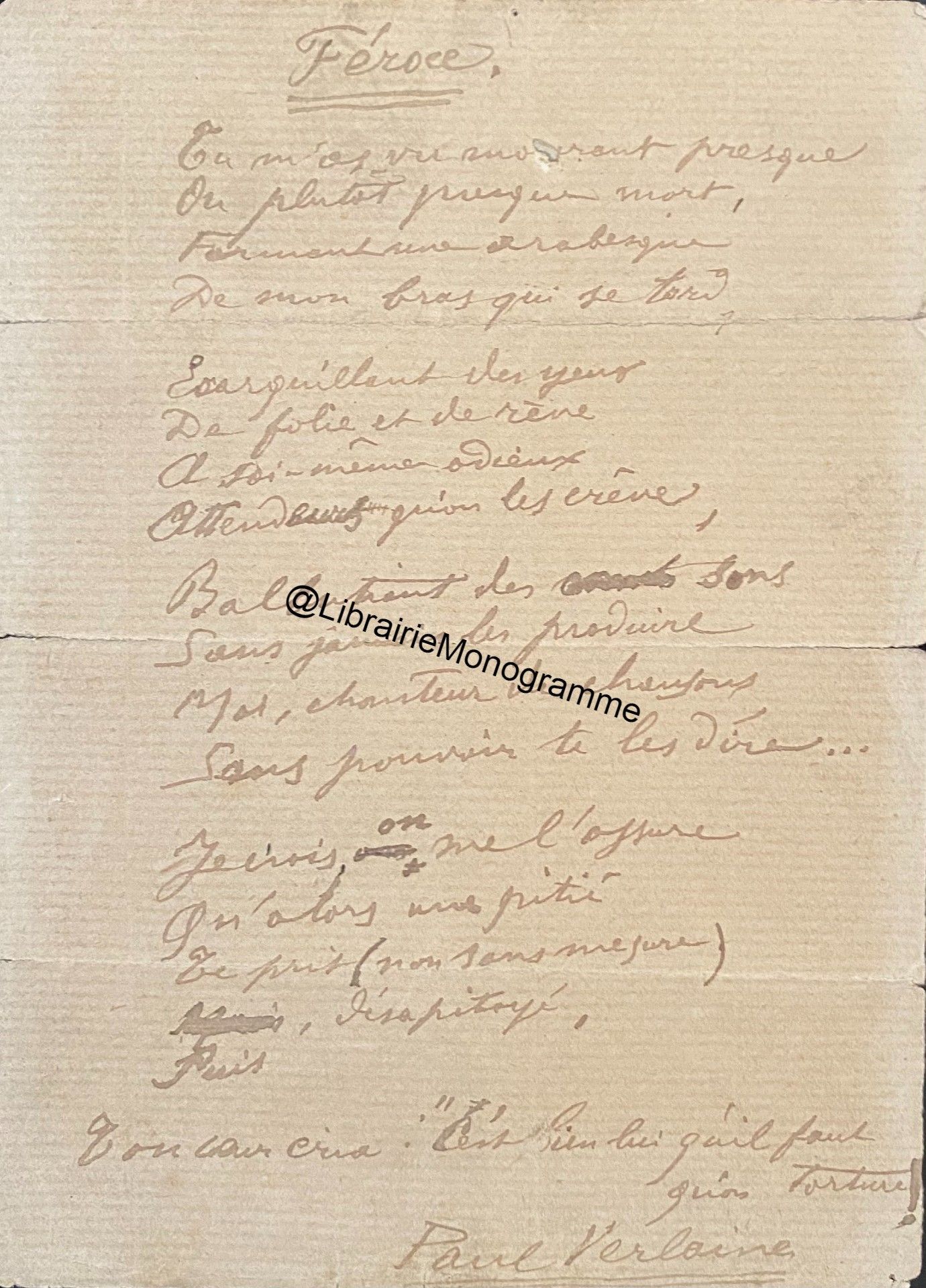 Poème autographe signé intitulé « Féroce » 1 pp. in-8.