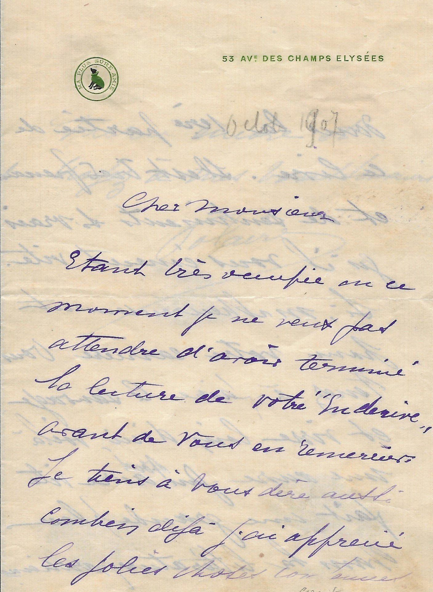 Lettre autographe signée (pneumatique) à Mme Magdeleine. Paris, 6 octobre 1927. 4 pp. in-12. Devant d’enveloppe conservée.