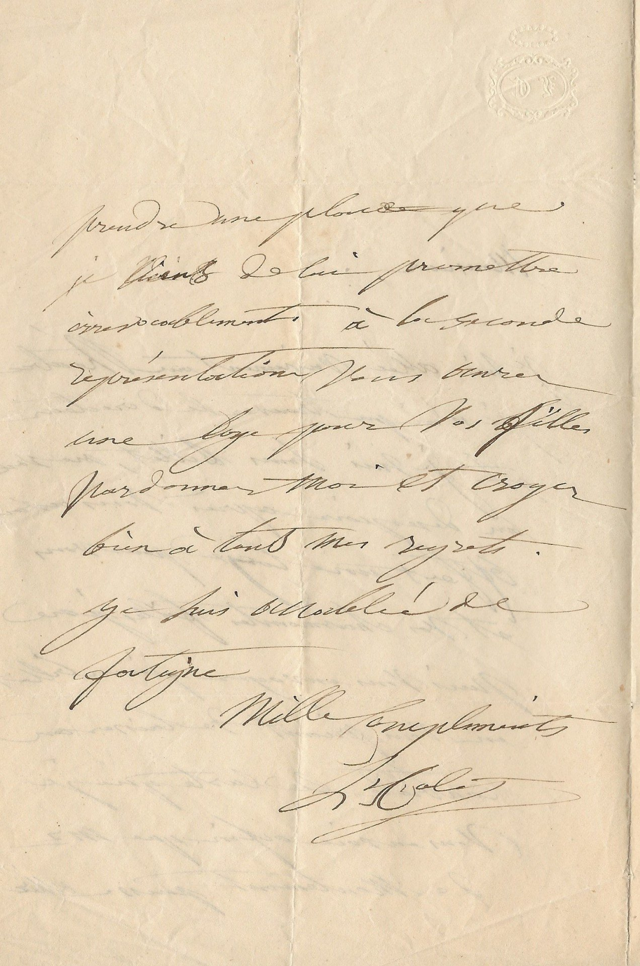 Elle lui demande de venir la voir au château, souhaitant connaître les dernières nouvelles de Paris et surtout de pouvoir s’informer de l’actualité politique et littéraire parisienne. « Vous me tenez donc rigueur, et ma lettre, un peu tardive il est vrai, ne vous a pas touché. Ne soyez pas si méchant et venez me conter ce qui se passe à Paris dans le monde politique et le monde littéraire, je suis toujours un peu triste, un peu souffrante et très inquiète du président. Aurez-vous un fauteuil et Musset en aura-t-il un ? Réponse à tout cela et une petite causerie qui fera le bonheur de notre salon de Château. Mille amitiés bien vraies. ».