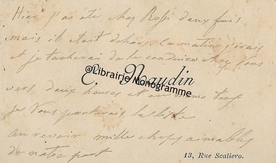 « Je regrette infiniment de n’avoir pu avoir l’honneur de vous recevoir ce matin. J’espère que vous voudrez bien m’en dédommager en venant vendredi prochain pour la soirée chez moi tous les vendredis. Je réunis quelques amis, ils se feront ainsi que moi une fête de vous entendre et d’apprécier votre voix et votre talent dont mon ami Vivienne fait les plus grandes éloges ».