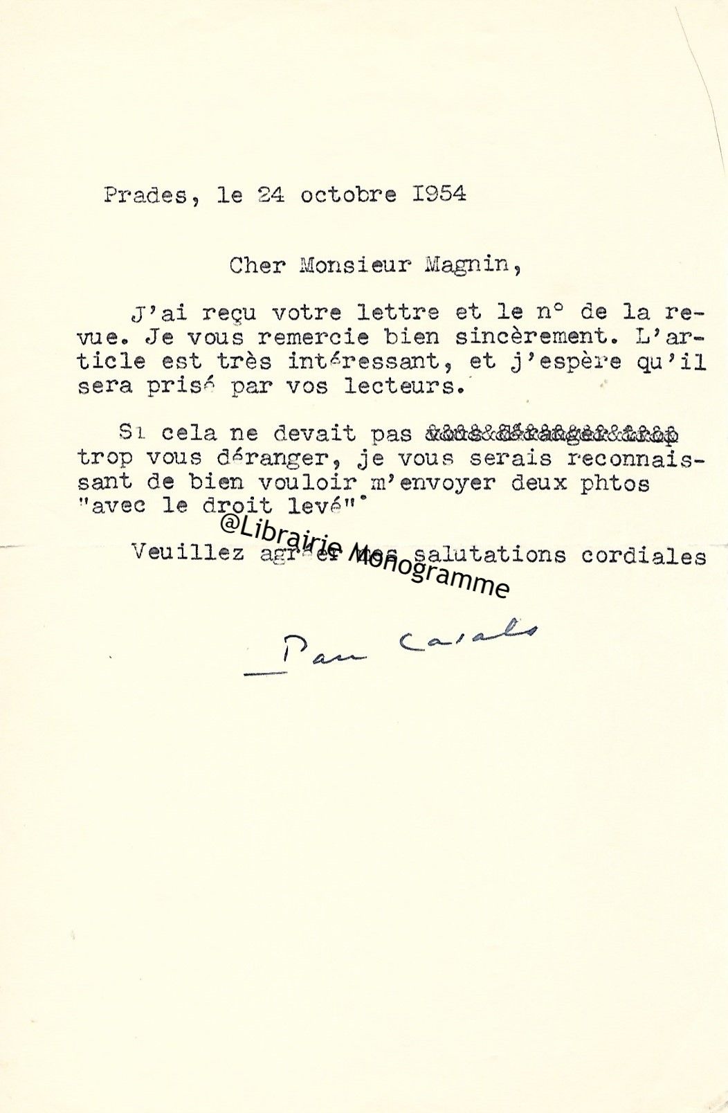 Il attendait pour lui écrire afin « de connaître les dates. Mais déjà longtemps je vous avais répondu en pensée combien j’étais heureux de tous ce que Joseph Calvet [le célèbre violoniste, fondateur du fameux quatuor Calvet] m’avait appris. Ils travaillent entièrement et l’exécution sera excellente ». Il le remercie de lui avoir proposé de lui retenir une chambre pour le festival. « Par la même occasion puis-je vous demander d’en retenir une seconde pour une amie qui se également au festival Nous arriverons le mardi 8 et resterons vraisemblablement jusqu’au 13… ».