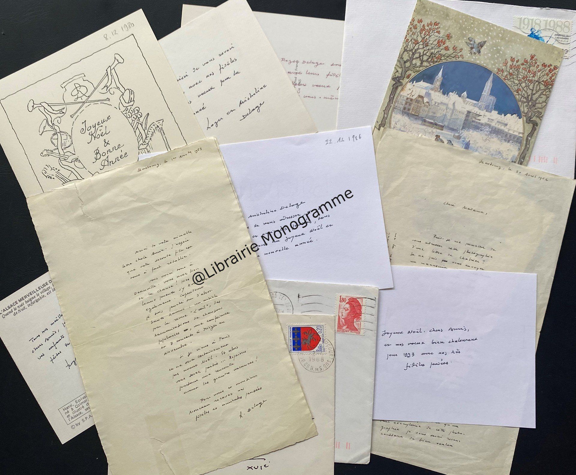 Belles lettres. A propos de sa candidature à l’Académie des Beaux-Arts. Il espère le soutient du peintre pour sa candidature, afin de succéder au fauteuil vacant de son ami, Darius Milhaud. « Une longue et parfaite amitié de cinquante années qui m’a liée à lui est, évidemment, une raison bien insuffisante pour justifier l’ambition de siéger dans votre illustre compagnie. Puis-je cependant espérer que vous voudrez bien m’accorder votre voix amicale, en cette occasion solennelle, que je viens solliciter ? Ce serait pour moi, vous le pensez une grande fierté de l’obtenir…». Les années ont passées et en 1985, c’est à l’ami et maintenant au confrère qu’il s’adresse, manifestant sa reconnaissance pour lui avoir adressé « une charmante lettre après l’émission TV du samedi soir », où il a pu y dire, « des choses qui sont chères à ma pensée d’artistes brimés par un faux modernisme… ». Il est fermement hostile et opposé comme de nombreux intellectuels, à la réalisation programmée des travaux relatifs aux « Colonnes de Buren », travaux qu’il caractérise de dépenses inutiles et absurdes. « Quant aux Colonnes du Palais Royal c’est le comble de l’absurde. Il y a cinquante ans les surréalistes mettaient des moustaches à la Joconde mais c’était en effigie, PAS sur le tableau de Léonard de Vinci… ». Pressé de le retrouver « Quai Conti où vous manquez trop, je fais des vœux pour le prochain et complet rétablissement de votre santé… », lui avouant qu’il n’avait pas encore pu se rendre et visiter son exposition, mais songeant à la rejoindre très prochainement, « On a dit mercredi passé qu’elle est admirable… ».