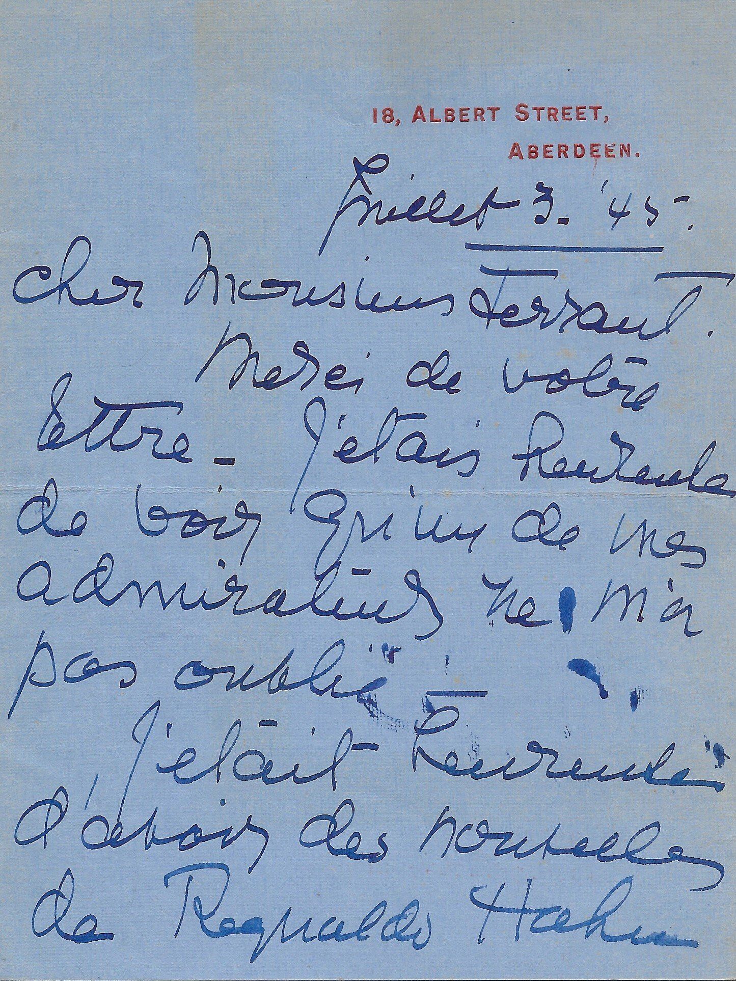 Jolie lettre de remerciements à son admiratrice. « Comment vous remercier ! Votre pensée et votre magnifique gâterie me comblent. Je suis heureux si j’ai pu donner à mon public un peu de mon amour pour l’art et si j’ai pu un instant l’isoler des horribles choses de ces temps affreux… ».