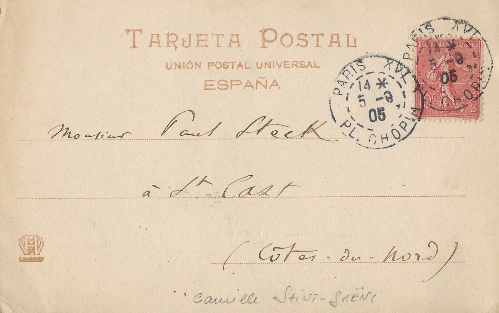 Carte de visite autographe signée « Pablo », au compositeur français Camille Saint-Saëns. Biarritz, 18 août 1902.