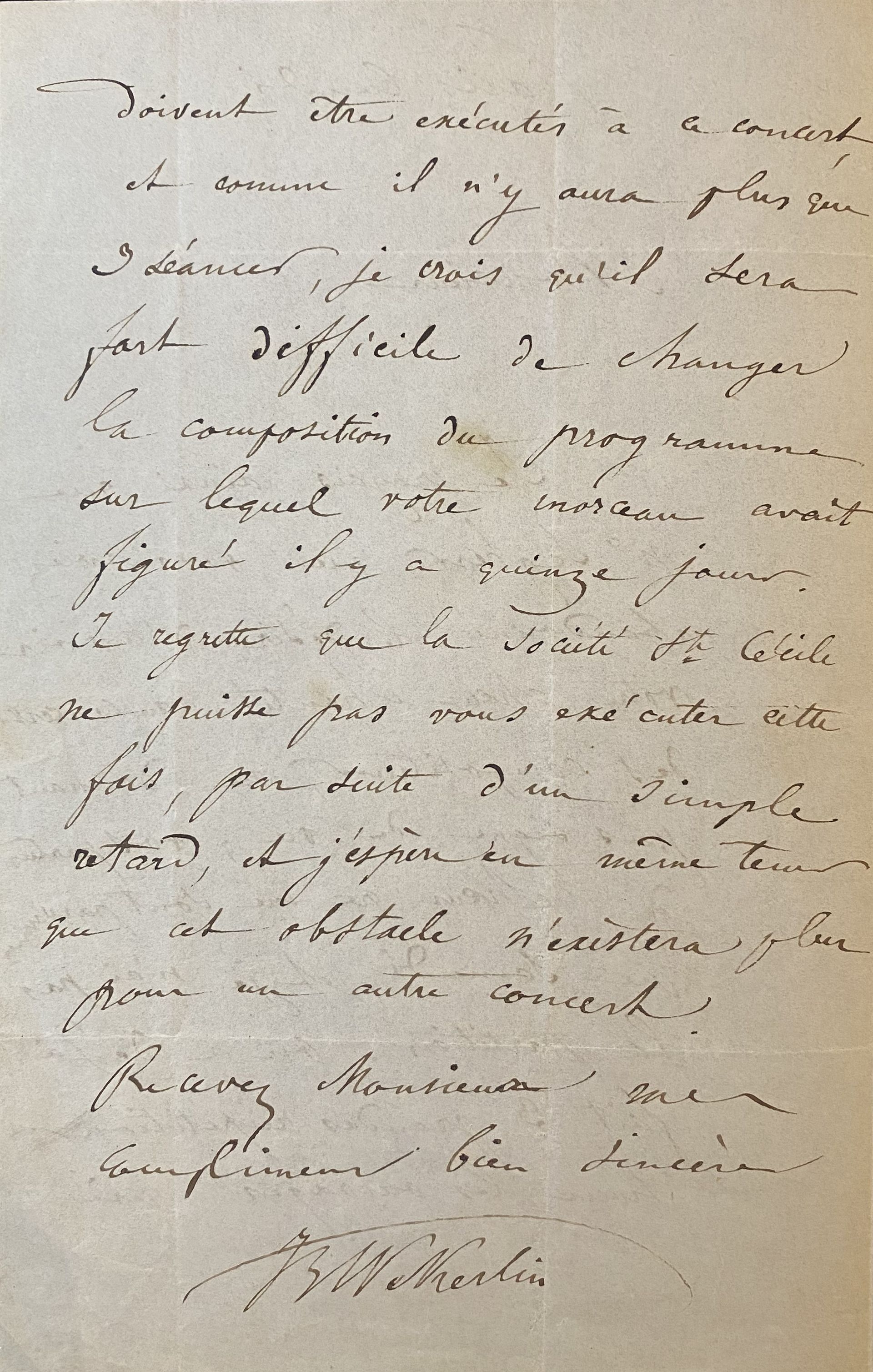 Dans cette première lettre, il est bien désolé de ne pas avoir reçu à temps les partitions de Vervoitte qui devaient être chantées au concert des Compositeurs organisé par la Société Sainte Cécile « …Vos parties de chœur ne me sont parvenues que samedi, et je n’ai pas la partition. On a déjà fait 3 grandes répétitions pour les ouvrages qui doivent être exécutés à ce concert et comme il n’y a plus que 3 séances, je crois qu’il sera fort difficile de changer la composition du programme sur lequel votre morceau avait figuré il y a 15 jours. Je regrette que la Société Ste Cécile ne puisse pas vous exécuter cette fois, par suite d’un simple retard et j’espère en même temps que cet obstacle n’existera pas plus pour un autre concert… ». Dans sa seconde lettre, il précise à Vervoitte que la programmation de la Société Sainte Cécile n’est pas arrêtée et qu’il est tout à fait d’accord pour s’occuper du morceau qu’il lui propose. « Il n’y a rien de décidé pour Ste Cécile, nous donnerons peut-être un ou deux concerts extraordinaires dans le courant de la saison, mais je ne sais pas quand, rien n’a été arrêté. Je tiens donc votre partition à votre disposition. D’après les explications peu claires de ma concierge, je pensais même que vous deviez chercher ce rouleau un ou deux jours après que je l’avais reçu. Je trouve le morceau très bien et ne demande pas mieux que de m’en occuper si l’occasion se présente… ».