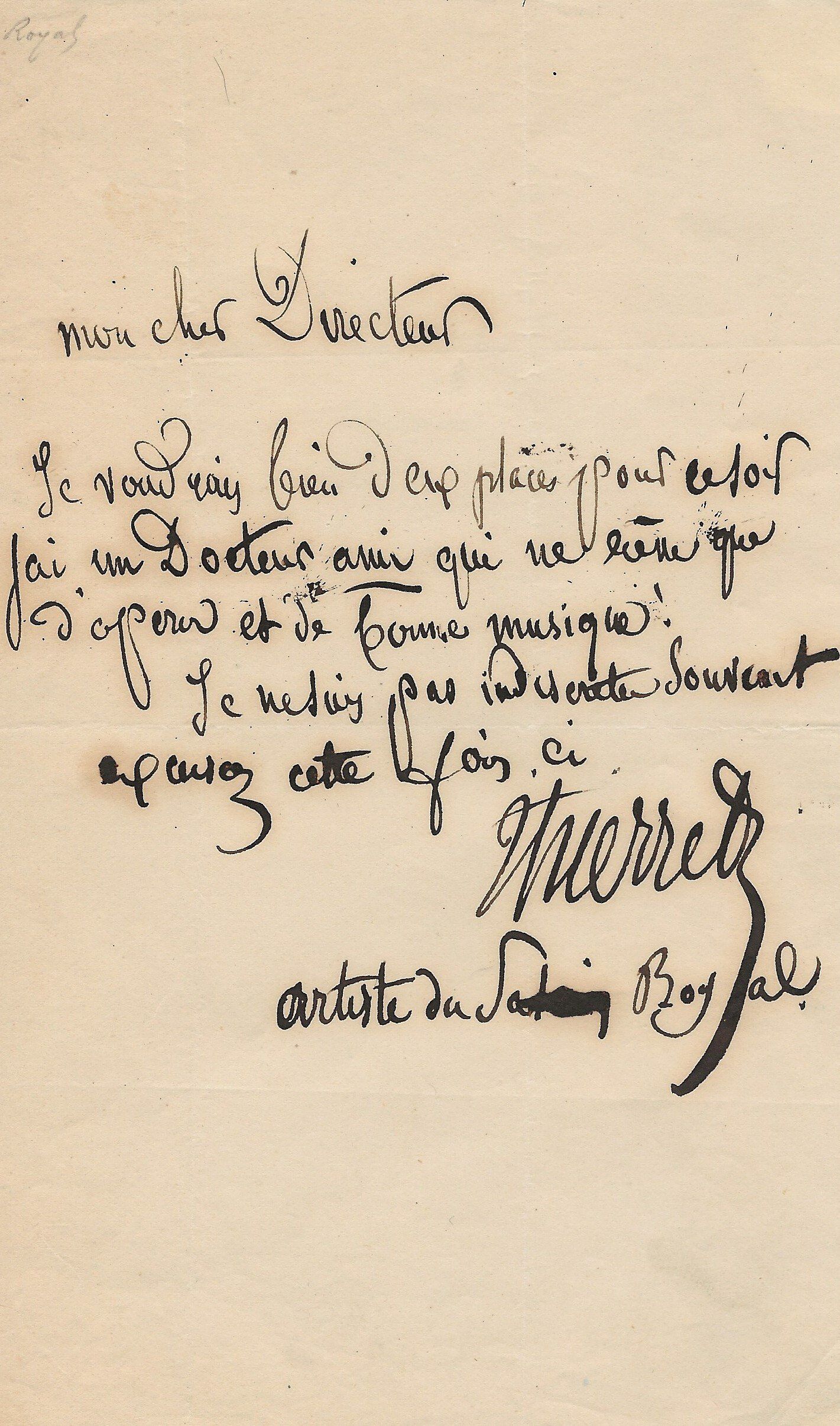 « On m’apporte une pièce de vers pour débiter devant S.A.R vendredi soir à la représentation de Cinna, ma mémoire n’est pas facile je n’ai qu’aujourd’hui et demain pour me rendre digne de l’auditoire de vendredi. Permettez-moi mon cher gentil fils Dumas de remettre notre dîner à samedi … Si vous voulez voir l’accueil qu’on fera au premier rôle, je vous garderai une stèle. ».
