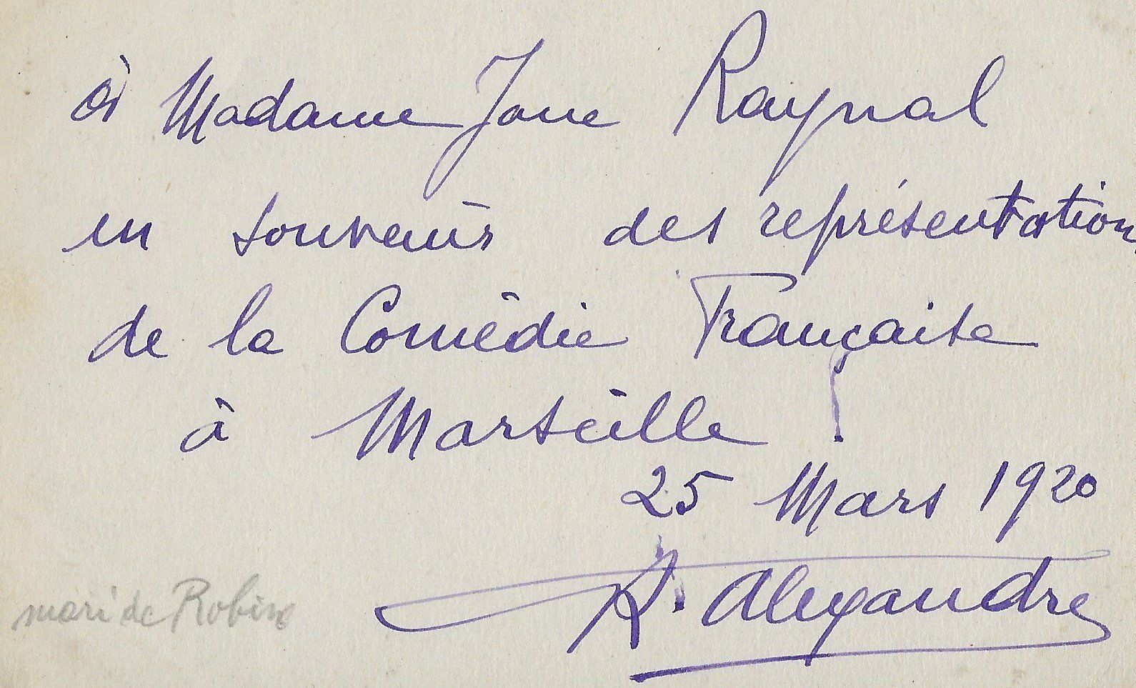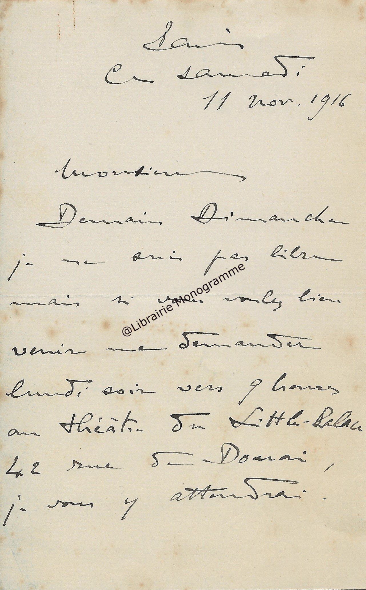 Il indique au producteur Volterra ses conditions pour le Théâtre de Paris. « C’est entendu je prendrai l’Animateur au deuxième tour, c’est-à-dire début de 1926 environ. Janvier courant, sans autre précision d’ici 15 novembre 1925… 700 par représentation 350 matinées jeudi…Mise en scène 6 000… ». A sa chère camarade, pendant la Seconde Guerre mondiale. « Il devient délicat de faire une protestation quelconque puisque vous avez joint à vos gentillesses un envoi de deux cents francs. Croyez bien que l’argent pour m’être utile me touche moins que la circonstance que vous avez mise à l’obtenir. Espérons que c’est la fin d’une vilaine période où la muflerie s’auréole de dénouement… Après la guerre j’espère que tout ceci s’oubliera… ».