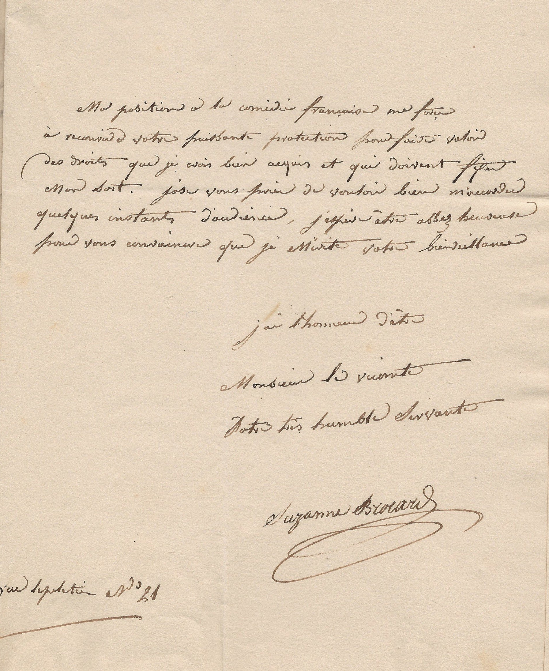 Il informe le philanthrope que la tragédienne et sa partenaire, dans la pièce de Racine « Andromaque », Catherine-Joséphine Duchesnois est dans un embarras mortel. Elle a son fils ainé au lit, attaqué « d’une horrible petite vérole ; elle ne peut pas partir avant d’être rassurée sur la santé de son fils ; elle désire que vous ajoutiez à son congé le peu de jours qu’elle va passer ici, et pendant lesquels elle fera son service, malgré qu’en vérité elle n’ait guère sa têt à elle ; ainsi de cette manière elle jouerait mercredi. Je trouve cela assez juste, surtout dans un moment où elle éprouve un si grand chagrin, car véritablement son fils est dans un état déplorable…».