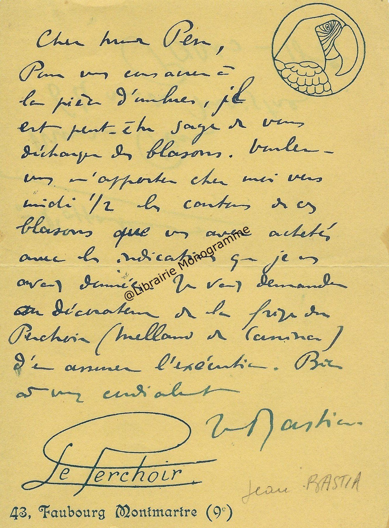 Jean BASTIA, chansonnier, parolier, acteur et chanteur français (1878-1940) 10 lettres autographes signées et une dactylographiée signée adressées au dessinateur, illustrateur et collaborateur PEN. Une de ces lettres est également signée par Saint-Granier et est dressée à Mme Pen, lui indiquant l’ouverture et la première du « Perchoir », décidée pour le 24 décembre 1916, « à 20 h45. Nous serions heureux si vous daigniez venir occuper les fauteuils 1/59 ». La plupart de ces lettres sont antérieures à l’ouverture du cabaret. Elles sont relatives à la participation et à l’organisation pour sa prochaine ouverture. (du 24 octobre au 9 décembre 1916). Elles sont la plupart décorées d’un perroquet, mascotte, dit « COCO, perroquet belge fait prisonnier à Bruxelles, s’est évadé de la forteresse de Torgau en prenant l’uniforme d’on officier bavarois ». L’ensemble de ces lettres traite dune intense collaboration avec Pen pour des projets d’illustrations, en particulier concernant le « blason du mercanti », dont Bastia lui donne une amusante description. Il est également question de son portrait qui figurera sur les programmes et catalogues. « Je désirerai que la tête ait la grosseur de la tête de Martini et qu’on ne voit de ma cravate noir que ce l’on voit chez Martini… ». [Augustin Martini était un chansonnier français né en Corse en 1882-1965]. Pen sera avec le décorateur Mellano de Cassina très performant pour les décors du cabaret ainsi que pour les dessins des artistes opérants dans ce music hall et du personnel actif. Une lettre du 21 février 1917, concerne les indemnités de Pen à partir du prochain spectacle à compter de cette date. « J’avais, après démarche de S. G. [Saint-Granier] en votre faveur, convenu que vous toucheriez cent cinquante francs pour vous au Perchoir, à partir du spectacle actuel. Et malgré les relâches qu’on nous impose, je vous compte à ce prix dans vos frais… ».