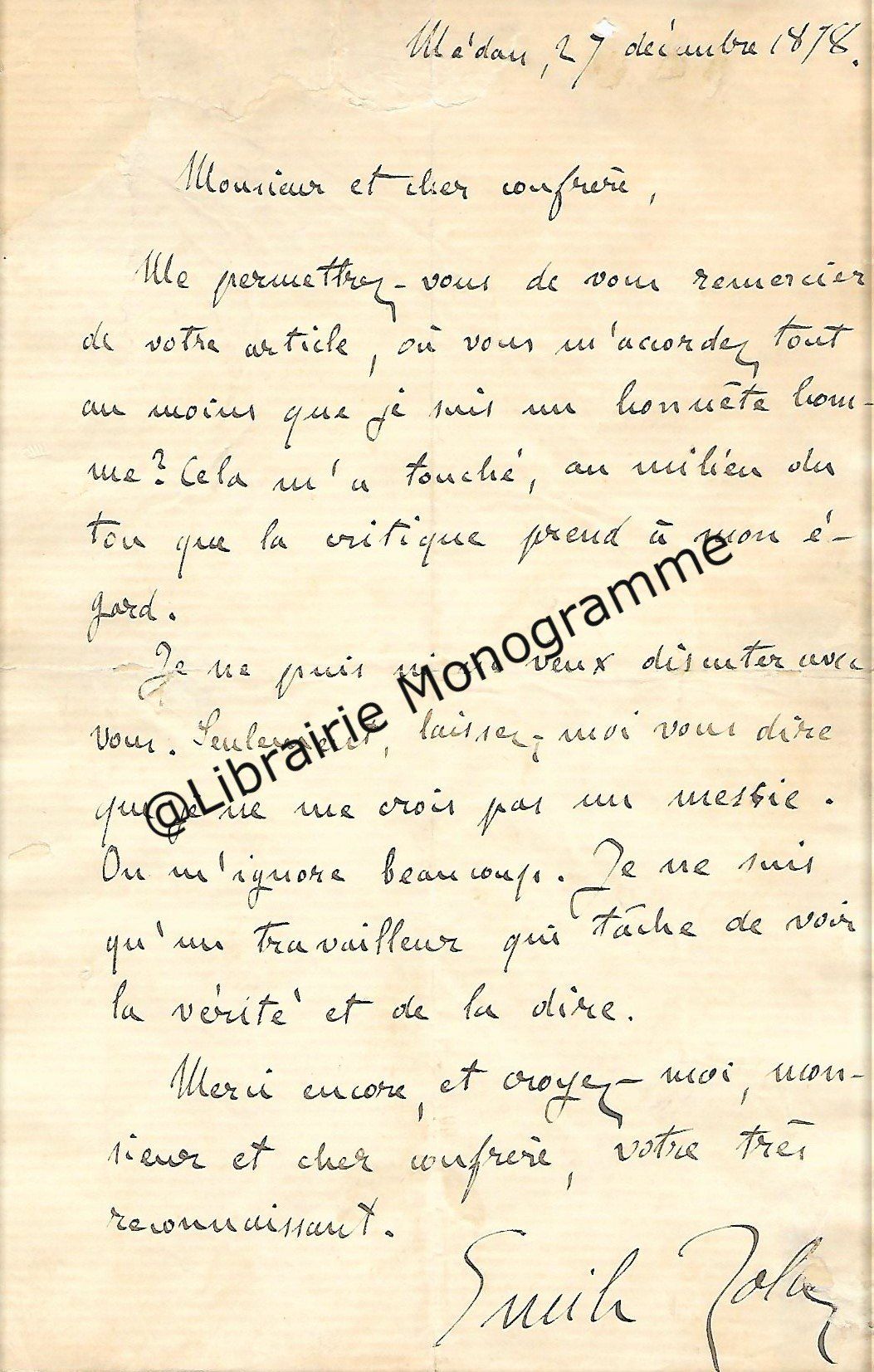 Lettre autographe signée à son « cher confrère ». Médan, 27 décembre 1878. 1 pp. in-8. Réparations et petites imperfections.