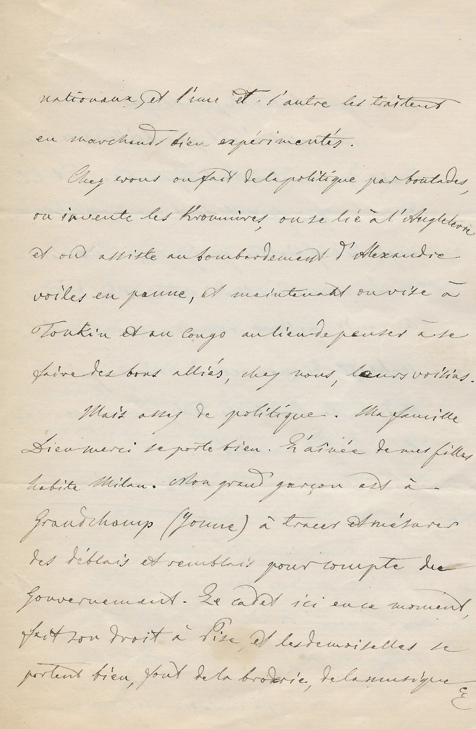 Intéressante lettre à son « cher ami ». Il lui présente tout d’abord ses meilleurs vœux pour la nouvelle année, puis lui explique pourquoi il a tardé à lui répondre : « J’ai retardé à vous répondre jusqu’à présent, désirant de reparler à Mr Rossi des prestations que vous avez faites à son beau-frère […] Avant de recevoir votre lettre, il m’avait parlé de ce que vous lui demandiez, en ajoutant que la recommandation pour son beau-frère n’était pas une autorisation à faire des frais pour son compte, il n’avait pas l’air de penser au remboursement ». Il le félicite de son nouveau choix de vie « Vous avez, mon cher ami quitté la cohue pour le calme, le frimas et le brouillard pour le soleil, enfin Paris pour Nice ». Il poursuit avec une critique étoffée de la politique menée par la France et l’Italie « Je conviens que la politique en France marche clopin-clopant, faute d’hommes à la hauteur de la situation, le même inconvénient se vérifie chez nous, mais la Commune ne relèvera pas aussi facilement la tête que vous le craignez. Il n’y a que l’Angleterre et l’Allemagne qui sachent conduire leurs intérêts nationaux et l’une et l’autre les traitent en marchands bien expérimentés. Chez nous, on fait de la politique par boutades, on invente les kroumires, on se lie à l’Angleterre et on assiste au bombardement d’Alexandrie, voiles en panne, et maintenant on vise à Tonkin et au Congo, au lieu de penser à se faire de bons alliés, chez nous, leurs voisins… ». Il termine en lui donnant des nouvelles de ses enfants « L’ainée de mes filles habite Milan, mon grand garçon est à Grandchamp (Yonne) à tracer et mesurer les déblais et remblais pour compte du gouvernement. Le cadet ici en ce moment fait son droit à Pise et les demoiselles se portent bien, font de la broderie, de la musique ainsi que toutes les jeunes personnes… ».