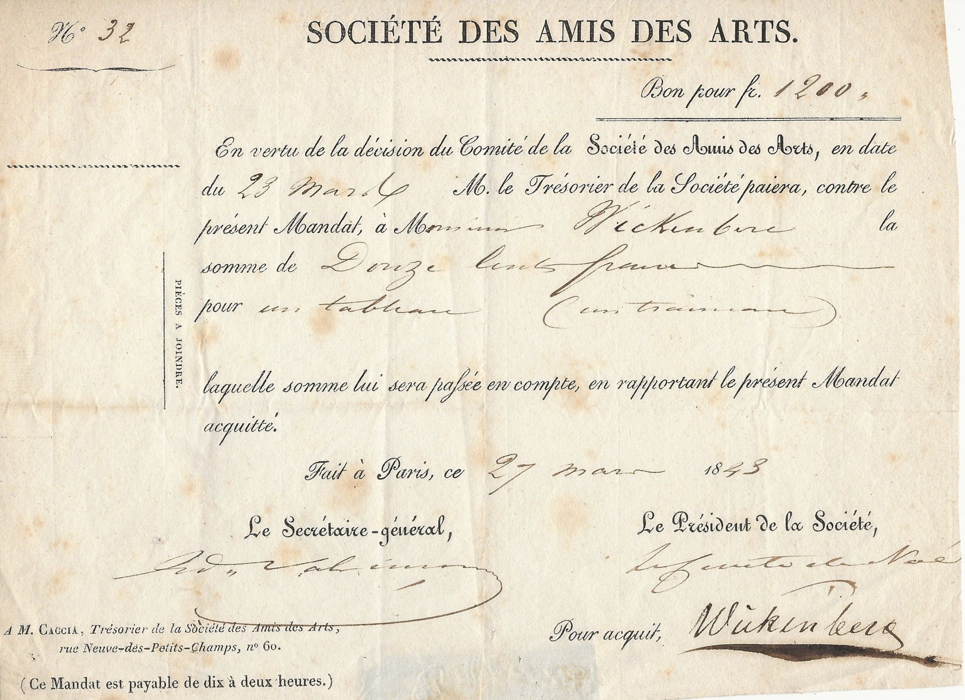 Reçu la somme de 1 200 francs pour le paiement d’un tableau (un traineau). Tableau qui pourrait probablement se trouver au Louvre. Reçu établi et signé par le Président de la Société, « Le Comte de Noé ». [CHAM ?].