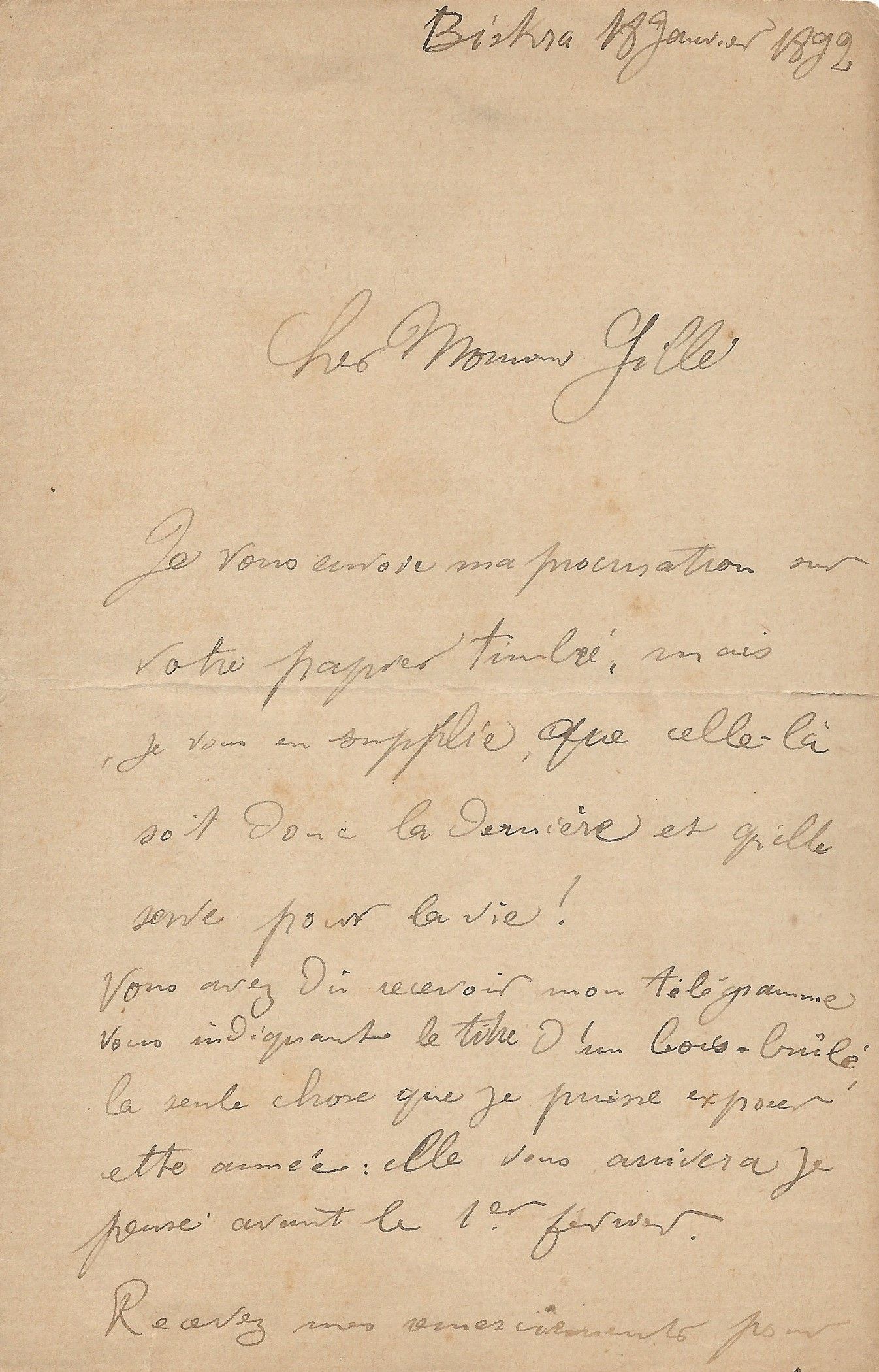 Belle lettre indiquant à son « cher ami » le nom des différents sculpteurs et de leurs œuvres données à l’occasion d’une exposition ou d’un Salon. « Voici les sculpteurs qui donnent. Moreau Vauthier (le sculpteur Paul Moreau-Vauthier) m’écrit que Chapu (le sculpteur et médailleur Henri Chapu) nous envoie un cadre de médailles choisies et que s’il avait eu un peu plus de temps il nous eut envoyé une réduction en marbre de sa Jeanne d’Arc. Le plus grand succès du Salon dernier. Je vais le faire foncer et si vous lui écriviez un mot au nom de la Commission en vous appuyant sur moi, peut-être, en lui accordant jusqu’au dernier moment, l’enverrait-il. Ce serait un morceau Capital. Dubois (le sculpteur français Paul Dubois) hésite à envoyer son Narcisse en marbre, une chose superbe. Il faudrait aussi lui écrire et payer l’emballage et les frais. Enfin Delaplanche (le sculpteur Eugène Delaplanche), va nous envoyer une réduction en marbre de son Eve (son grand succès) […] Chargez-vous de lui envoyer l’emballeur ainsi qu’aux deux autres, ils demeurent tous les 3 dans le même quartier et c’est de la crème de sculpteurs ; enfin Mouchot (le sculpteur Louis-Hippolyte Mouchot) va nous envoyer un tableau… ».