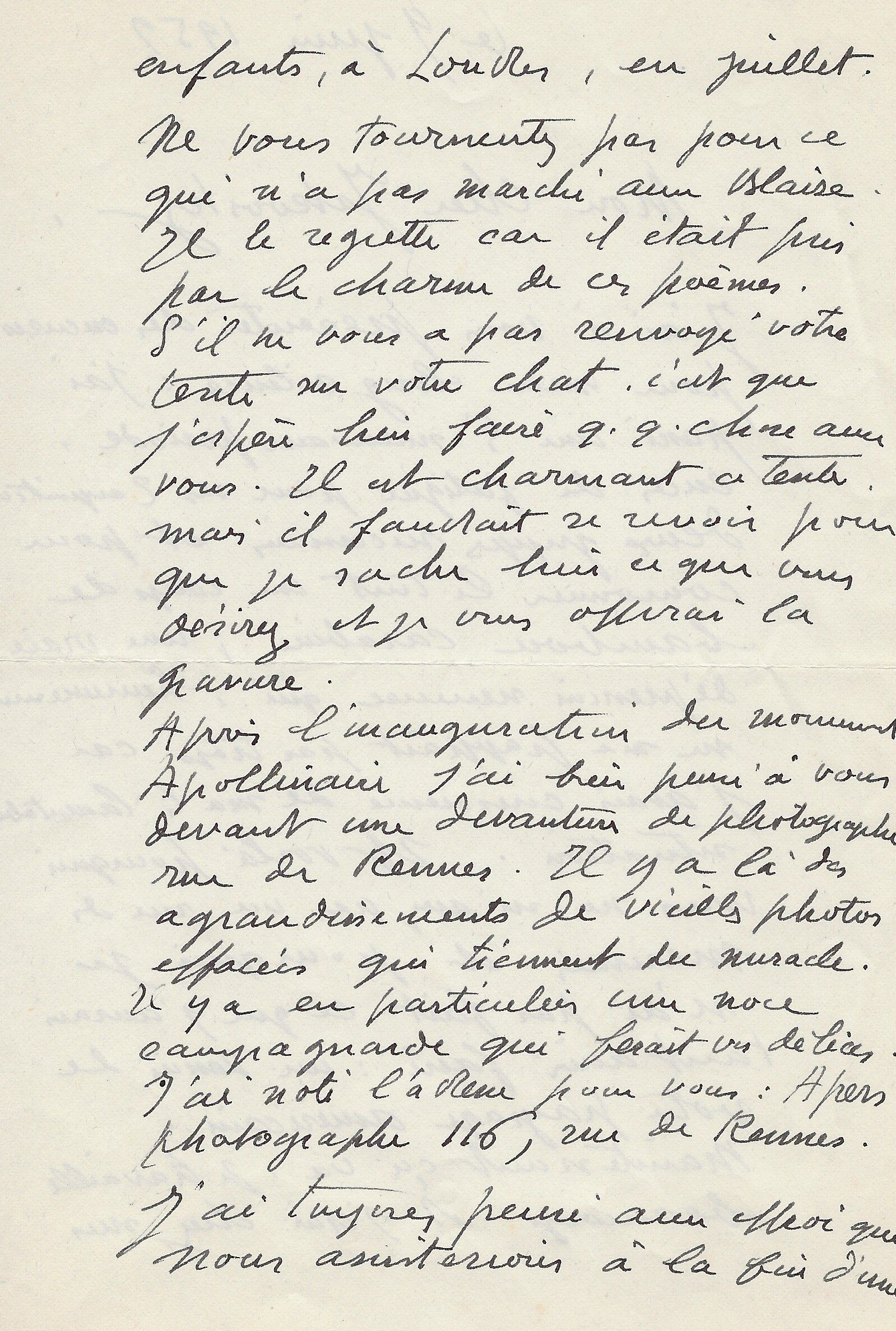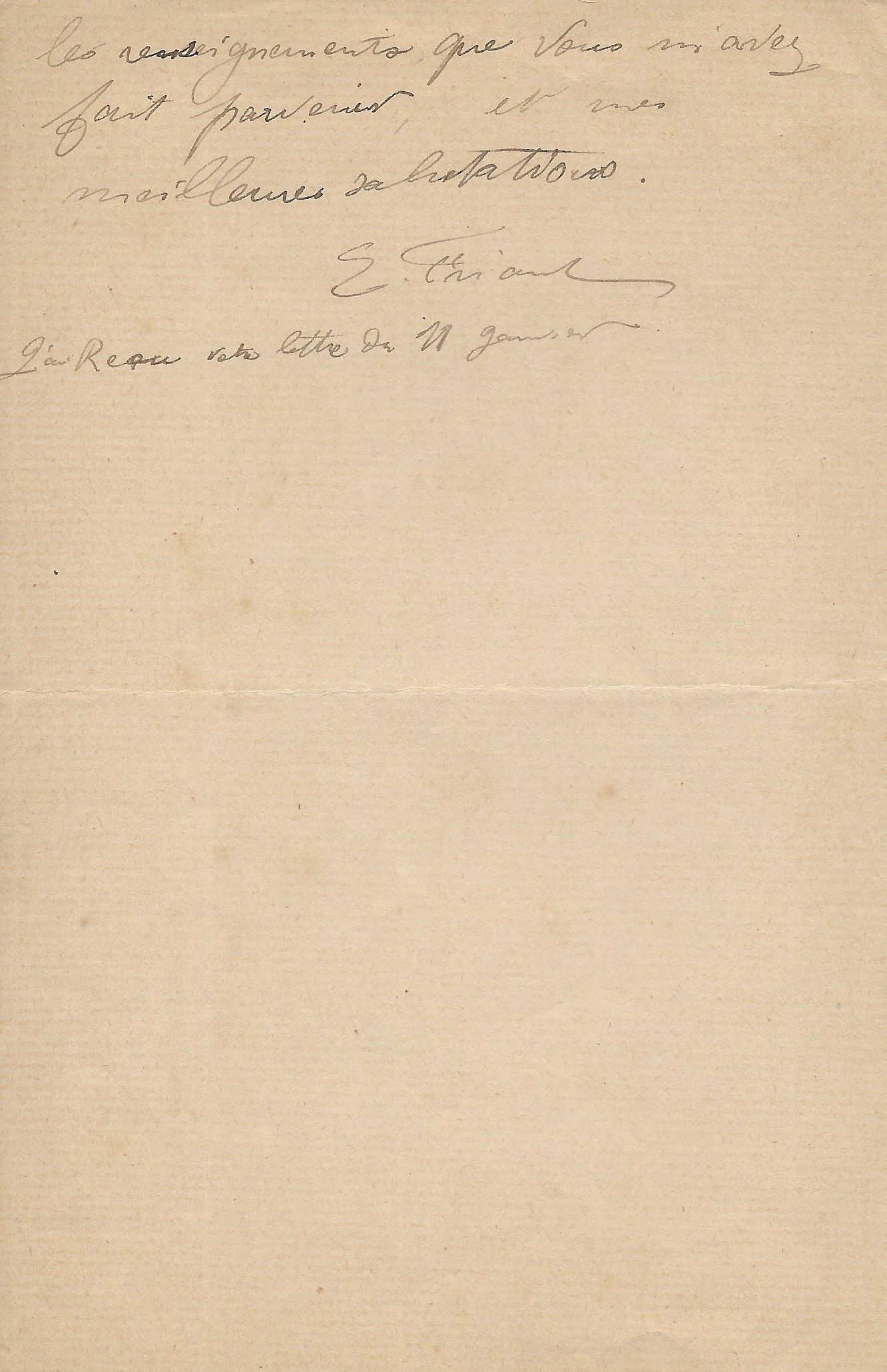 Il s’étonne de ne pas avoir reçu de réponse de Monsieur Loisy auquel il a précédemment adressé une lettre, suivant le conseil de son correspondant. « Merci de tout cœur au sympathique ménage ! Le titre du tableau est « intérieur. Il a son cadre-… ».