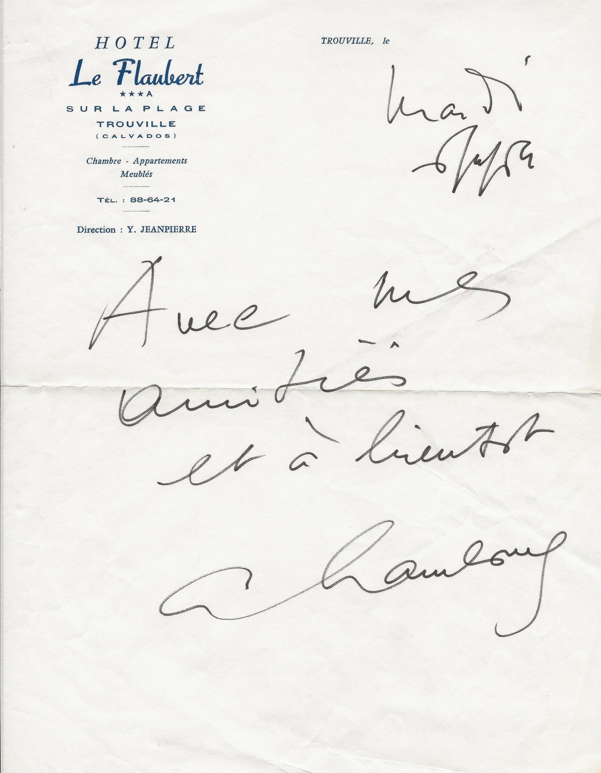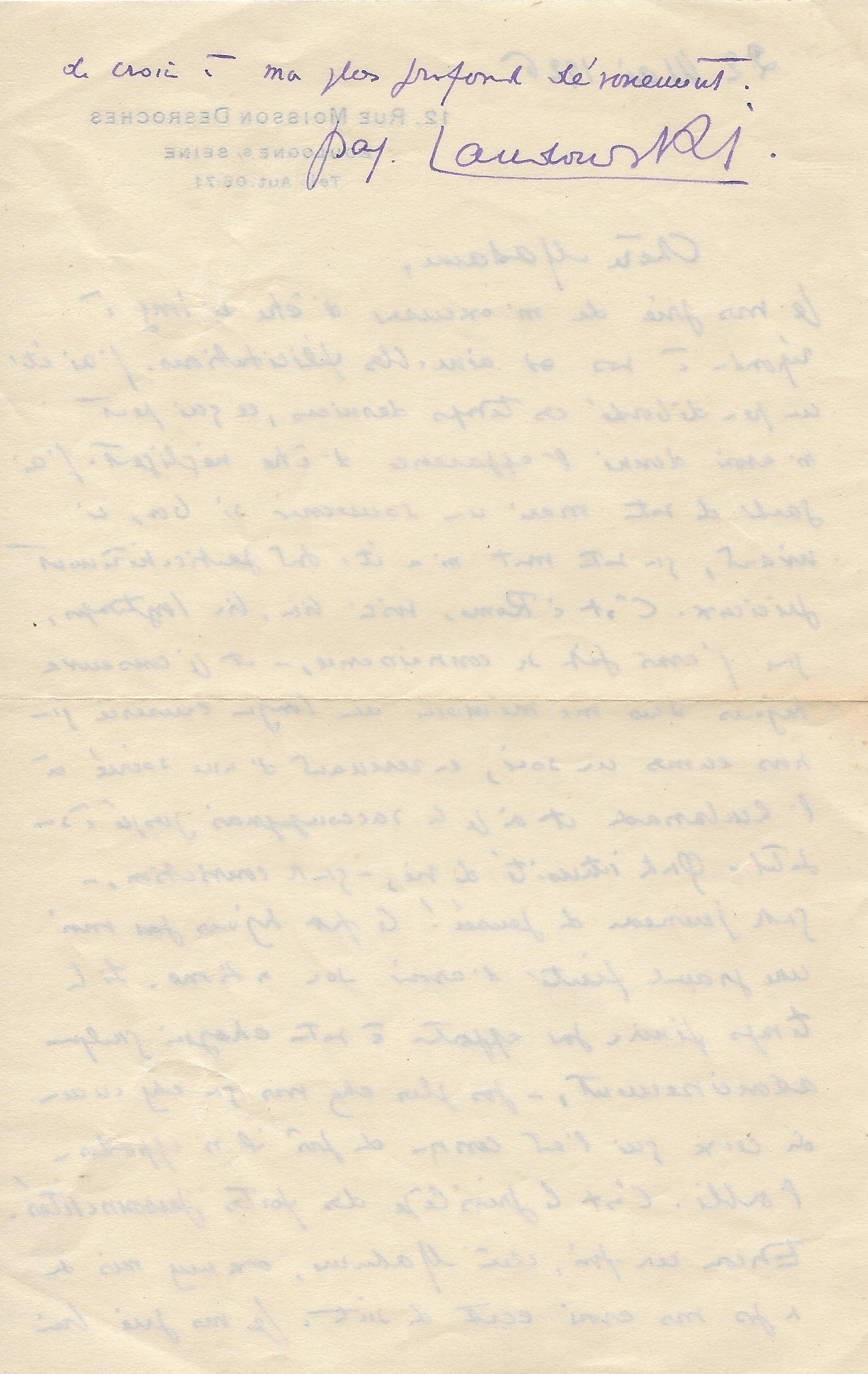 Belle lettre. Alors qu’il est en pleine lecture de « Beni Ier, Roi de Paris » (1926), il s’empresse de lui rendre hommage en lui exprimant son admiration, « votre style est délicieux et l’œuvre excellente à la fois moderne […] d’un gout parfait et truculent et d’un inattendu perpétuel. Et par-dessus tout profondément vrai… ».