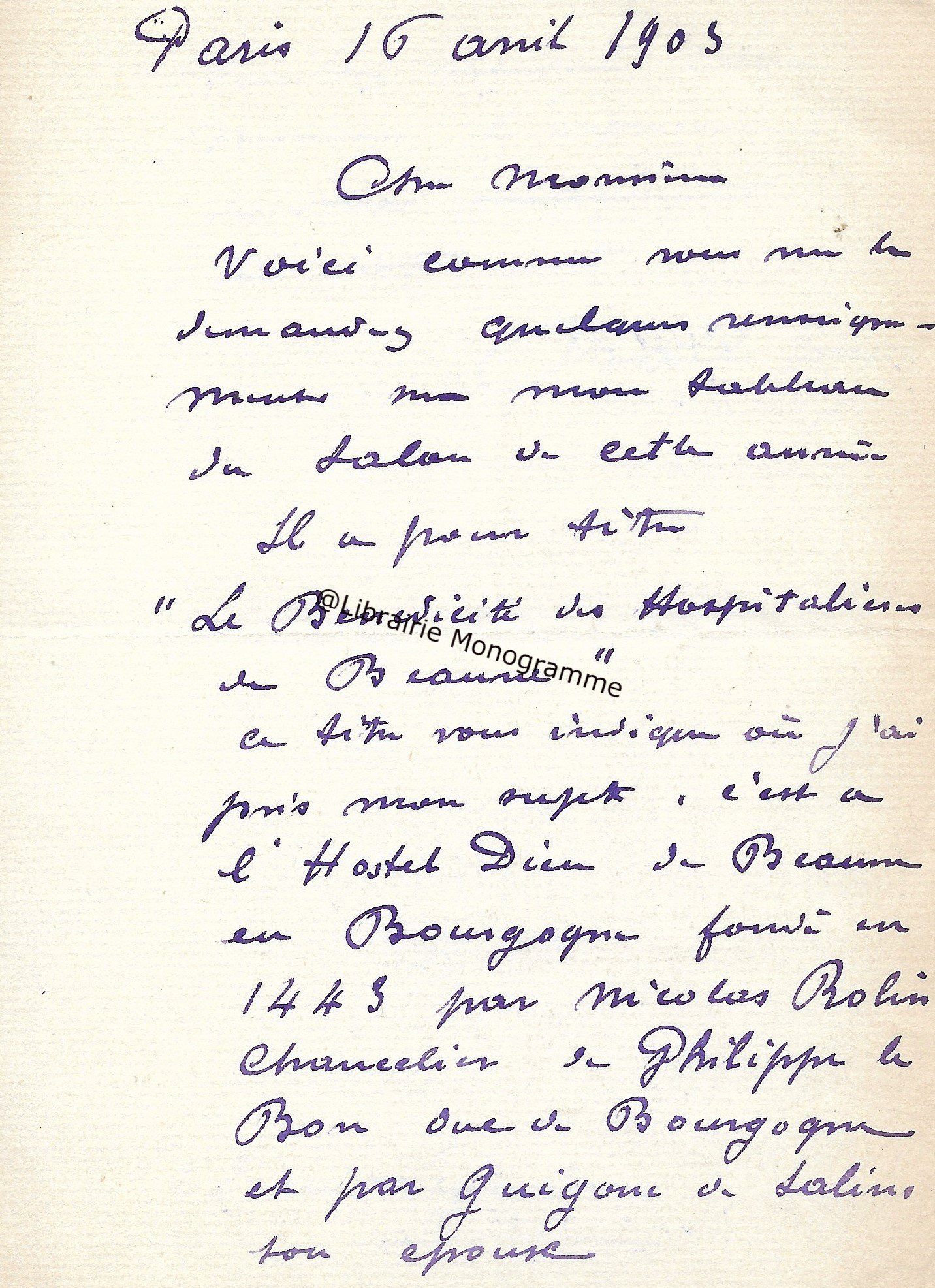 Très belle lettre à propos de son tableau « Le Bénédicité des Hospitalières de Beaune », tableau qui figura au Salon de 1903. Il adresse à son correspondant de nombreux détails à propos de cette œuvre en la décrivant selon son ressenti.