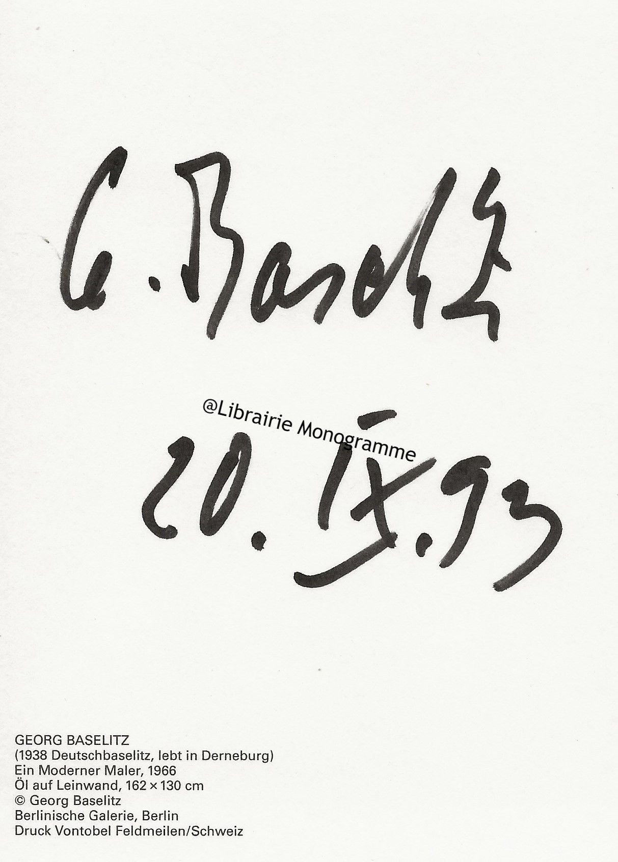 Signature et date autographe (20 septembre 1993) au verso d’une carte postale représentant une de ses œuvres de 1966.