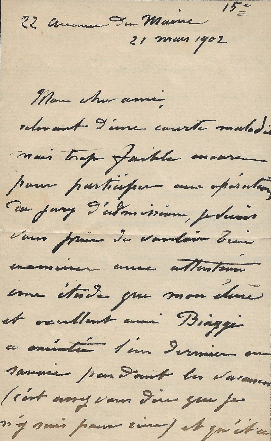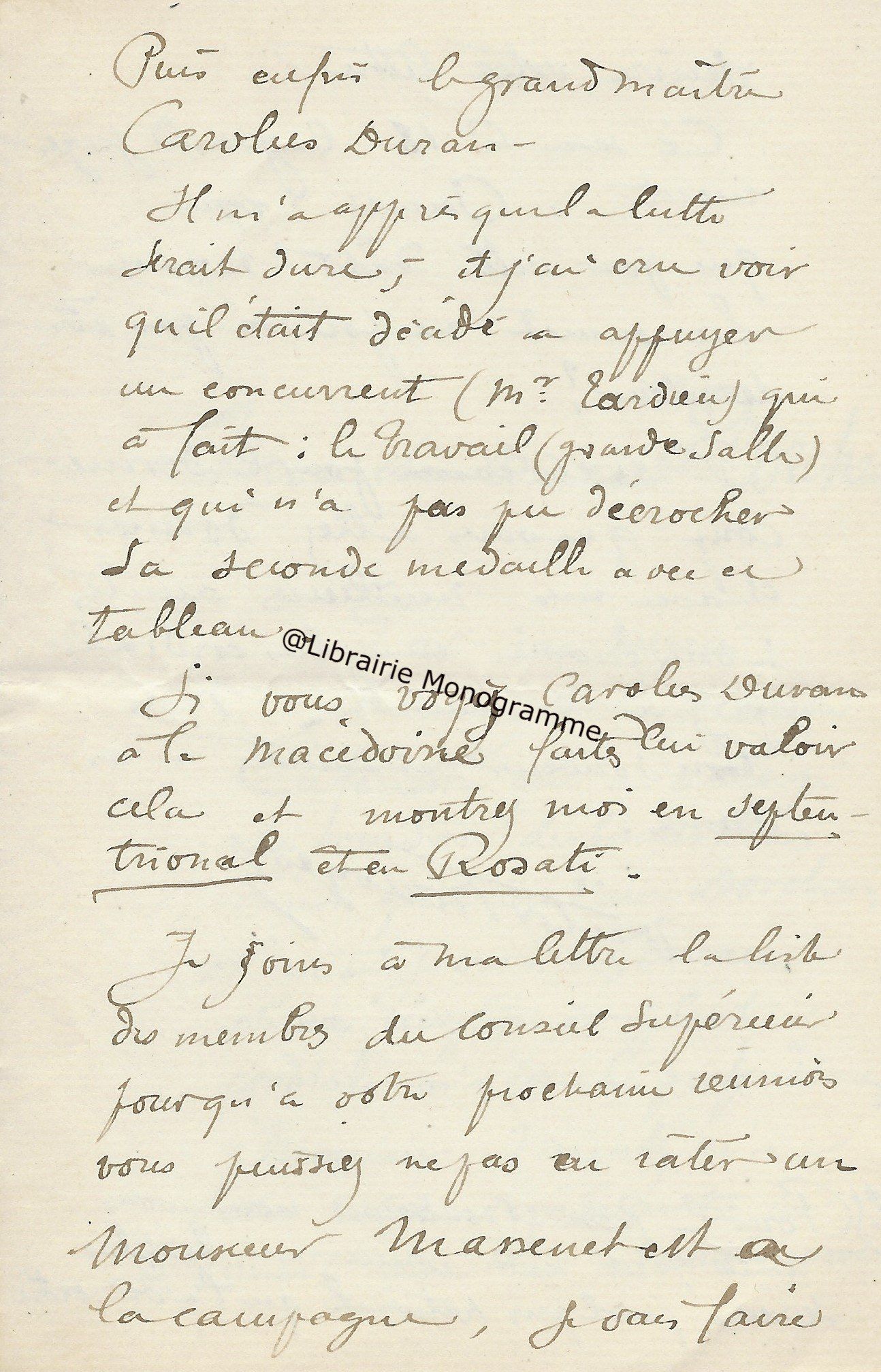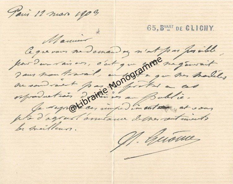A propos du Salon des Artistes français et des récompenses associées à cette exposition. Il souhaite à son « cher collègue et ami », une seconde médaille. « Je vous remercie bien vivement de vos compliments qui me font d’autant plus de plaisir que vous êtes un peintre de la bonne souche du bon maître Vollon. Votre intérieur d’église est extrêmement bien et nul plus que moi ne serait heureux de lui voir une seconde médaille, et ce ne serait que justice. Au moment des propositions, il vous a manqué 2 voix mais j’ai travaillé mes amis depuis et j’espère bien qu’au moment du vote définitif vendredi être plus heureux ».