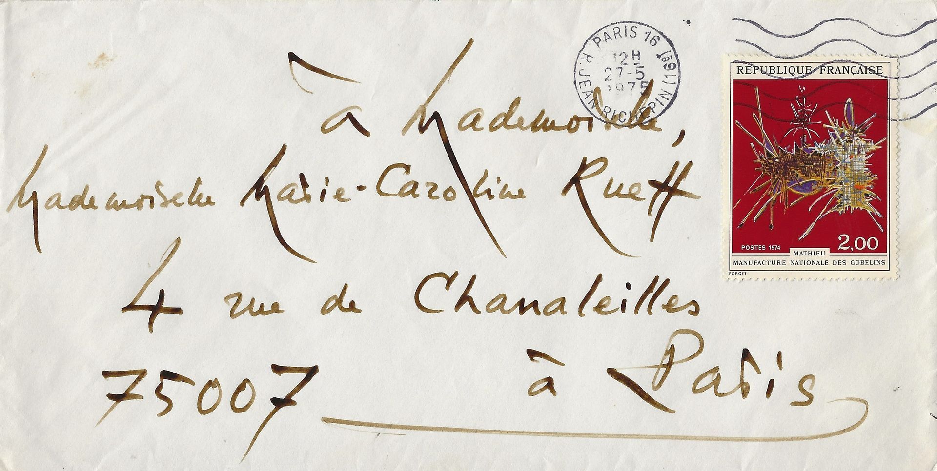 Enveloppe conservée avec adresse et marques postales.