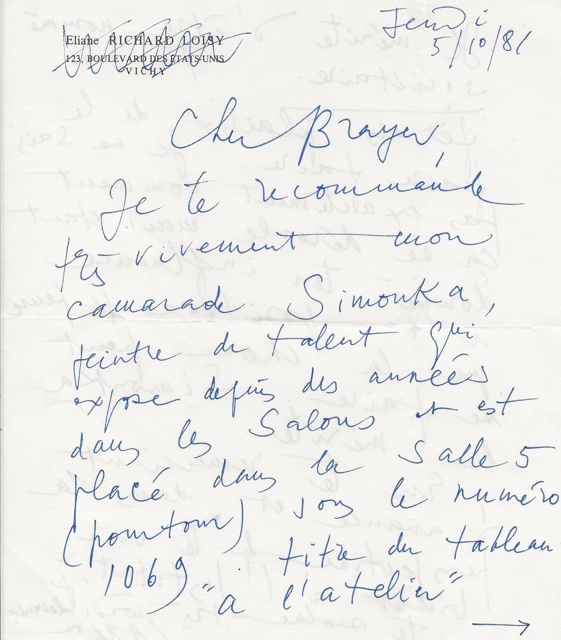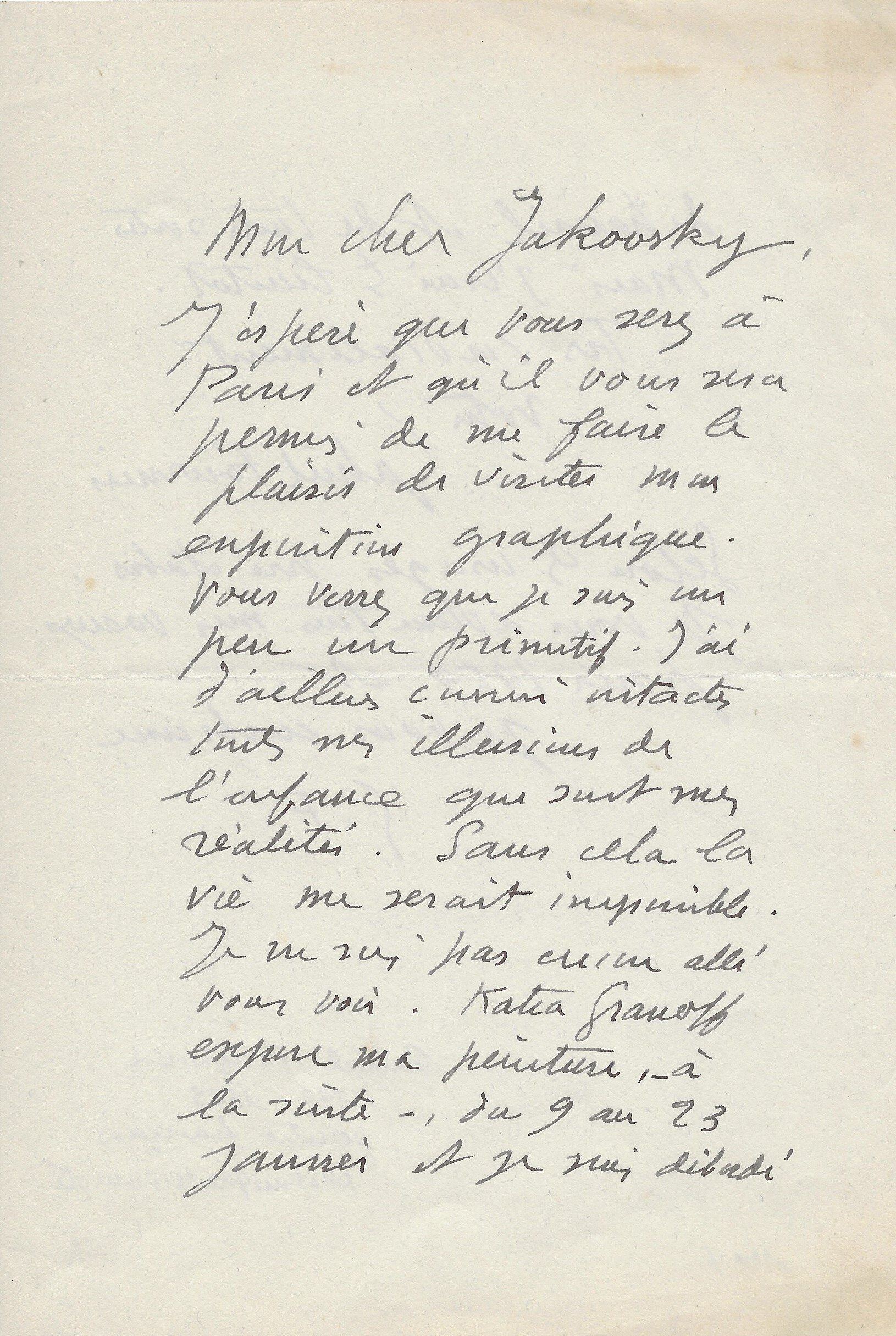Jolie lettre très certainement liée au portrait de Suzanne Kra. « Pouvez-vous venir un jour seule à mon atelier ? Il n’est pas facile de travailler quand il y a du monde et j’ai besoin de faire quelques croquis. Je compte sur vous ».