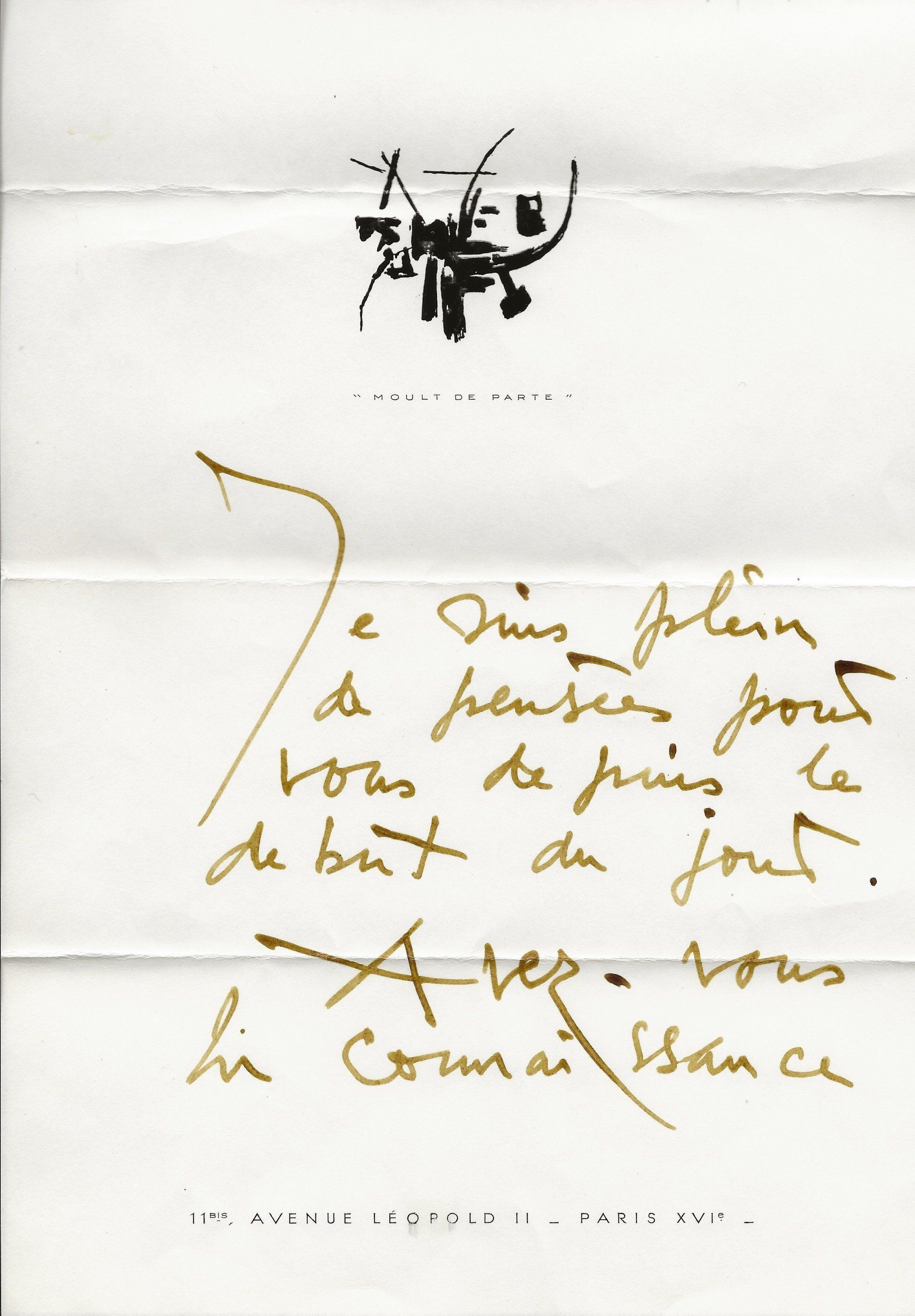 Révélations sincères à son ami, admirateur de toujours. Il espère être au vernissage du Quai Conti. « De l'Estrapade aux Médicis au Palais Mazarin ... que de chemin parcouru, que d'œuvres créées (la dernière que j’ai vu à Noël en l’église de Baumanière)… Pas mal de réactions favorables parmi tes confrères…».