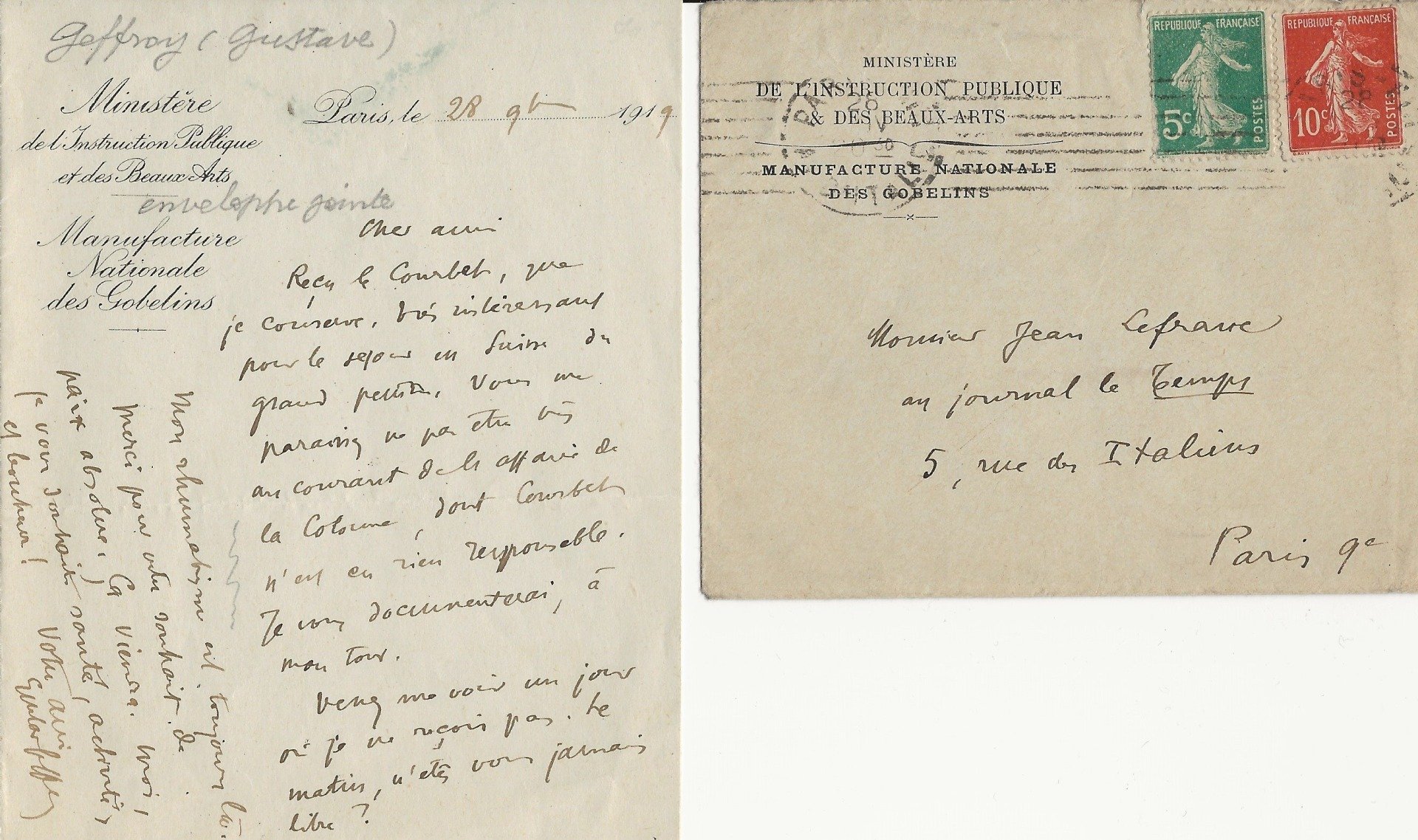Belle lettre du sculpteur, annonçant au ministre la mise à disposition de « six petits bustes », qu’il a réalisés. « Veuillez seulement me faire savoir où et quand je puis les envoyer…».